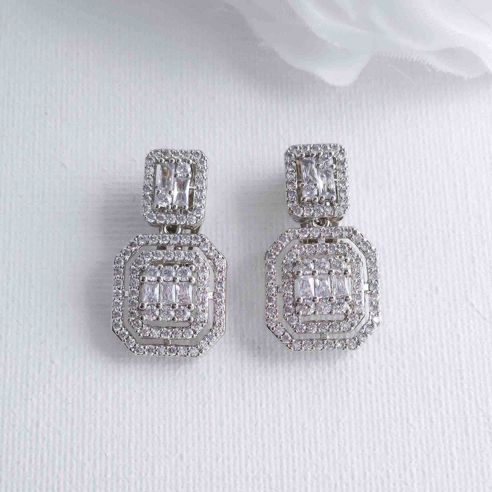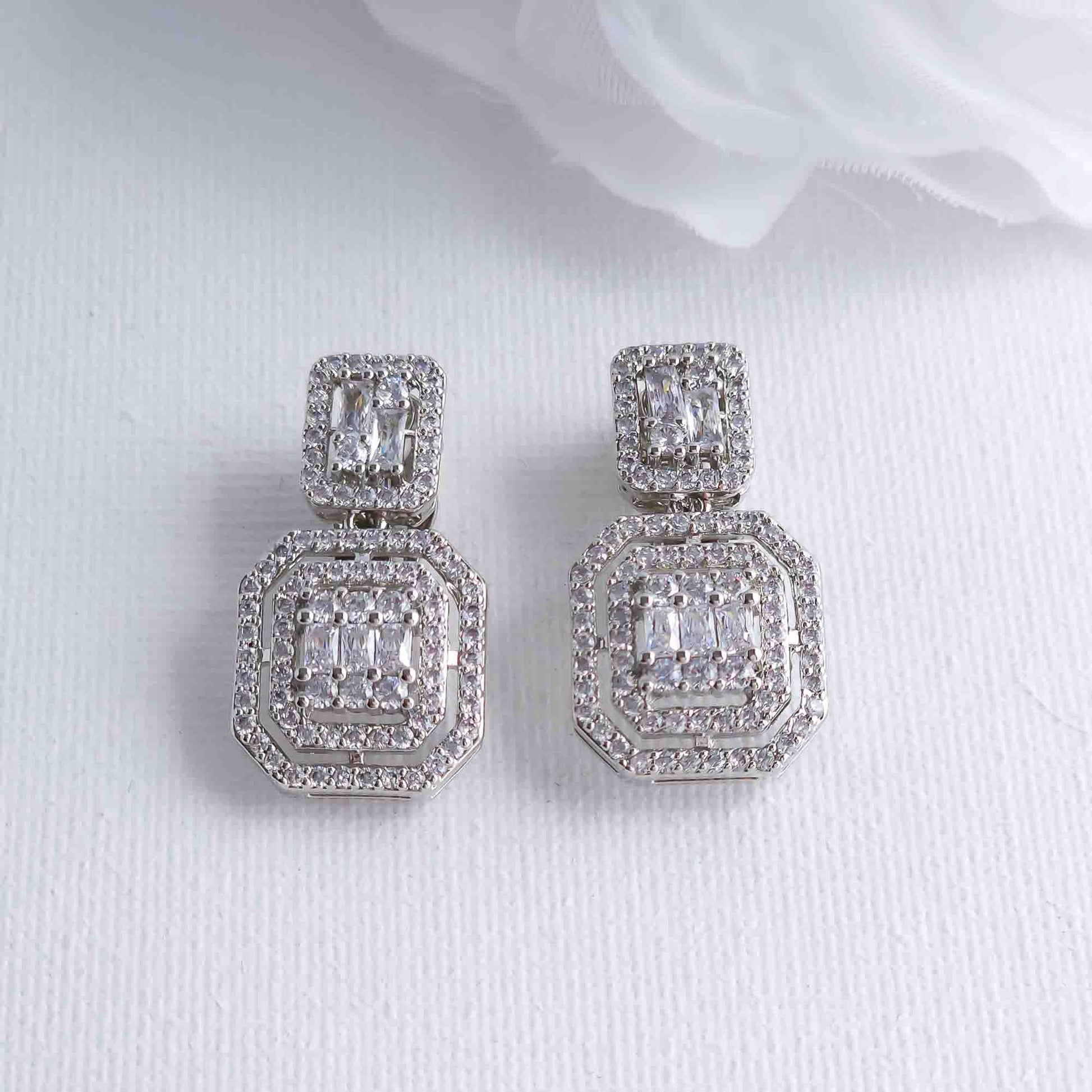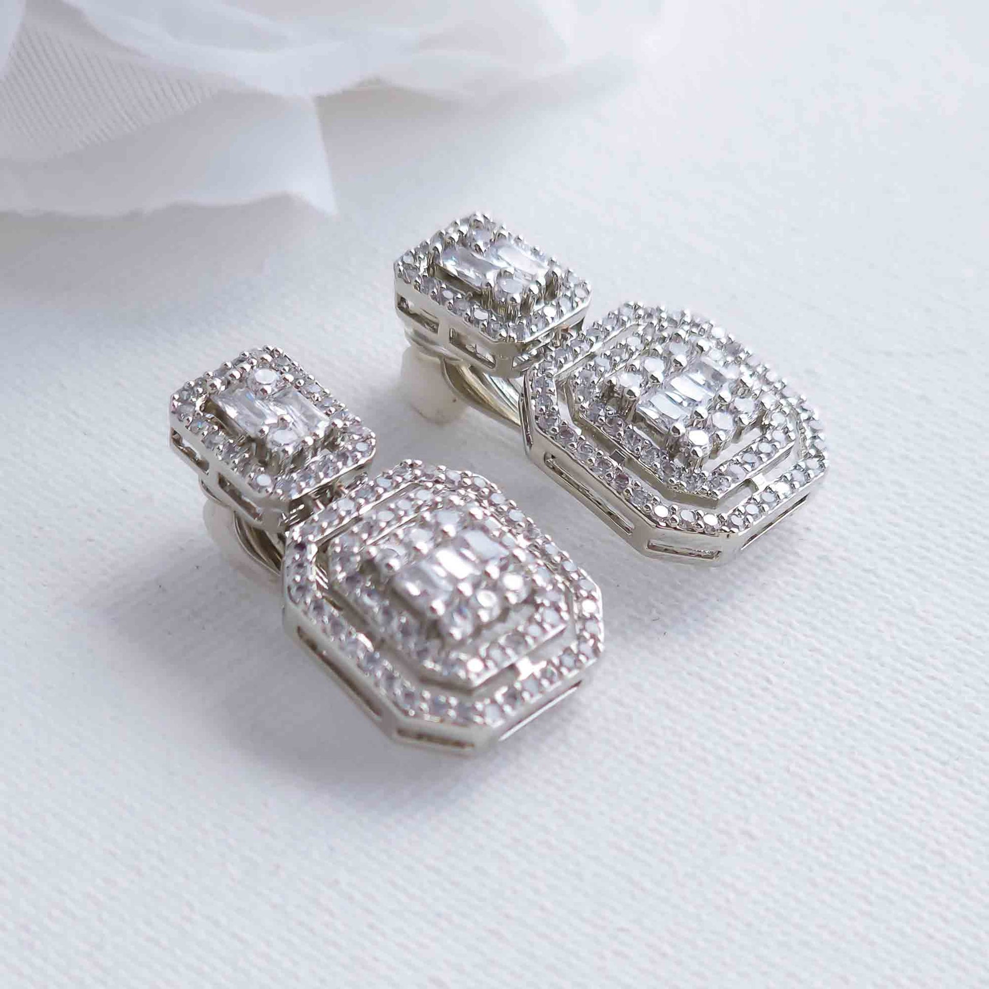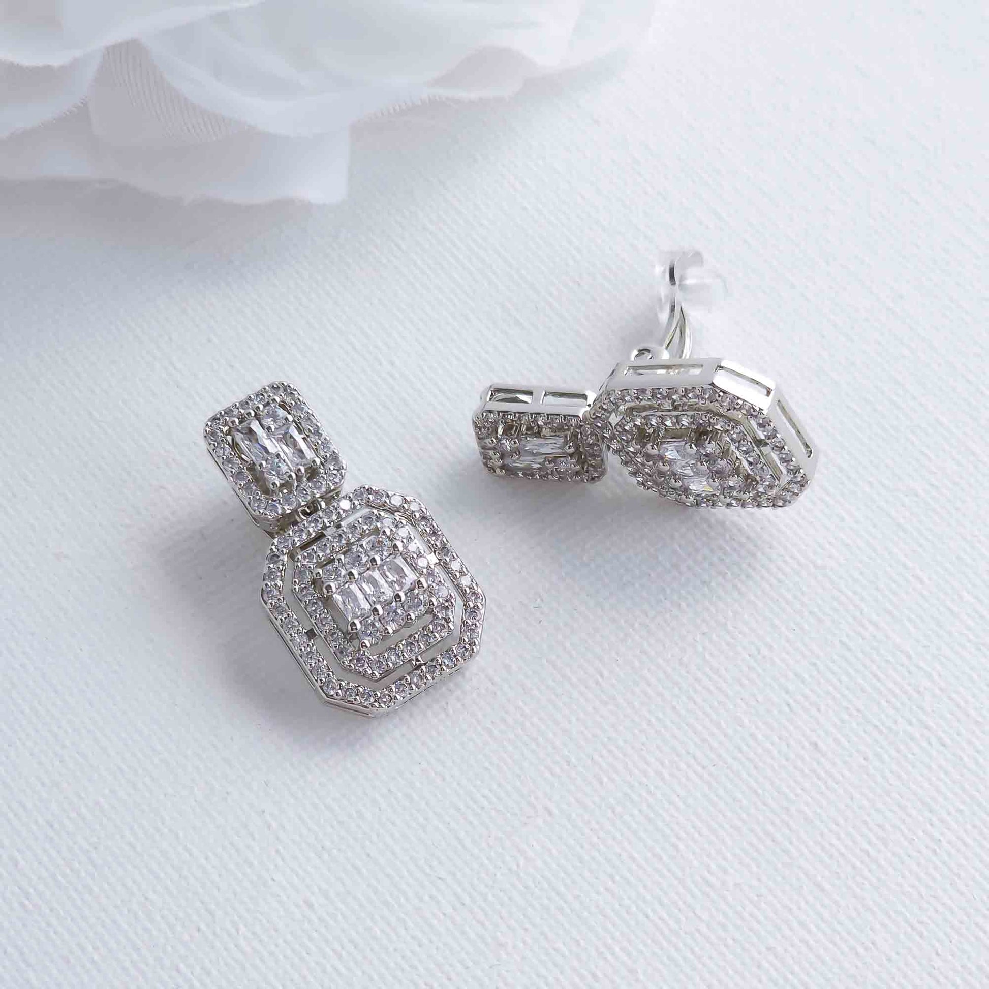 These non-pierced silver clip-on earrings feature sleek straight lines and rectangular shapes, reminiscent of classic Art Deco design, elegantly adorned with sparkling cubic zirconia stones. Perfect for any occasion, whether you are preparing for your wedding, attending a special event, or simply enhancing your everyday look, these non-pierced earrings provide an elegant solution.