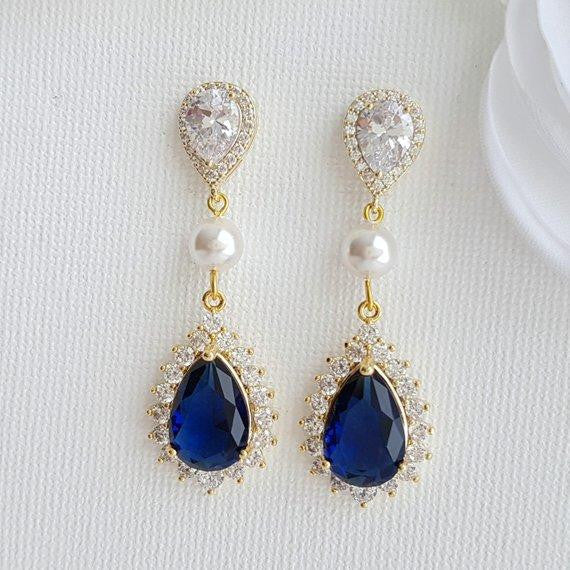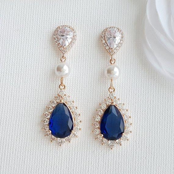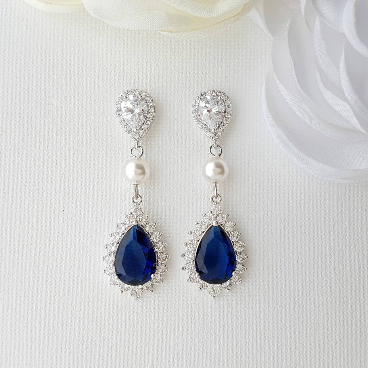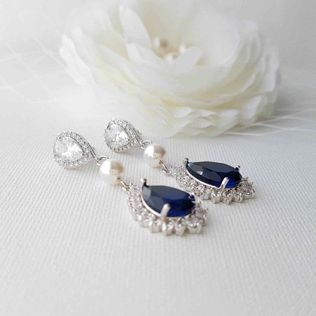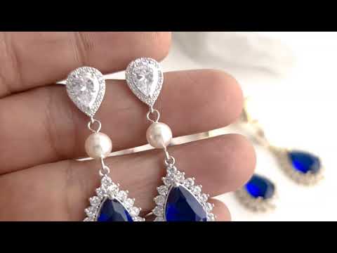 These blue clip-on wedding earrings are made with sapphire blue cubic zirconia drops and clear ear post in teardrop shapes interspersed with a round pearl to add to a lustrous look. This lovely pair of earrings can be combined with any of your traditional wedding dresses of cream, ivory/ white, or something contemporary like a blue dress you may choose. A great pair of blue earrings with clip-ons for brides and bridesmaids and special occasions, events and prom.