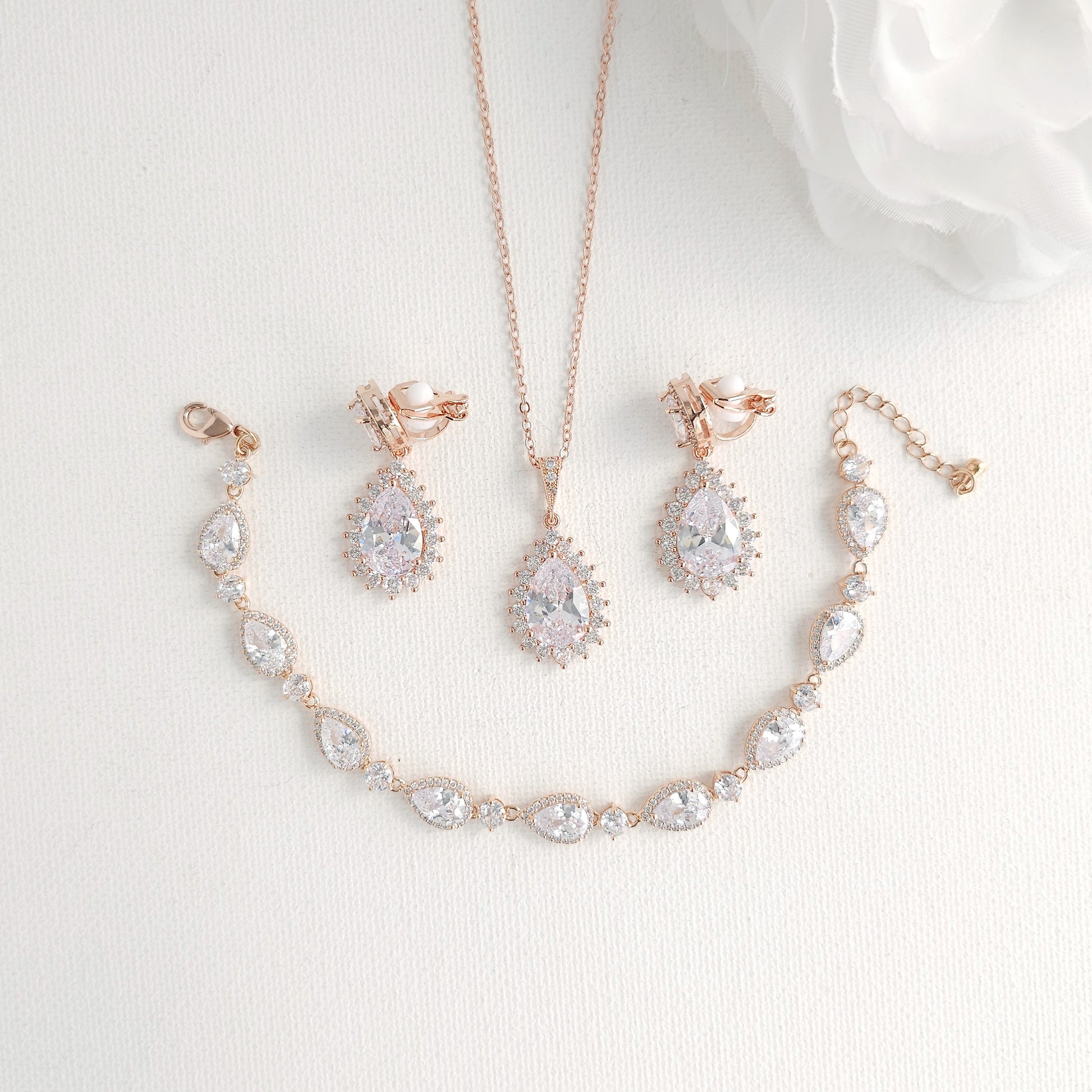 This necklace, bracelet, and clip-on earrings set is also available in a stunning rose gold and gold finish, so you can perfectly match your wedding day theme.`