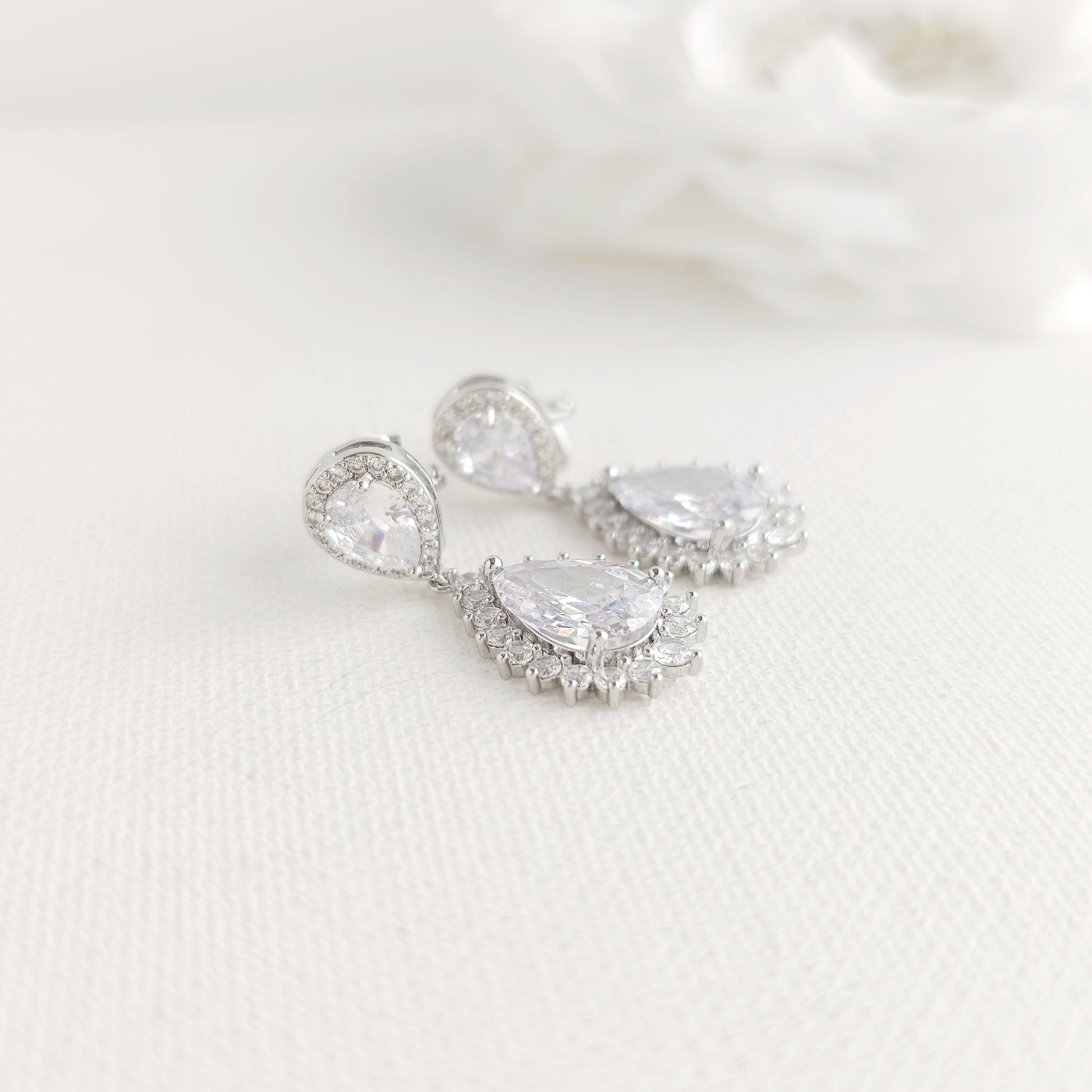 - Necklace: A simple teardrop necklace that perfectly matches the earrings and adds the perfect bling to your neckline. It is a traditional teardrop style with a bit extra.