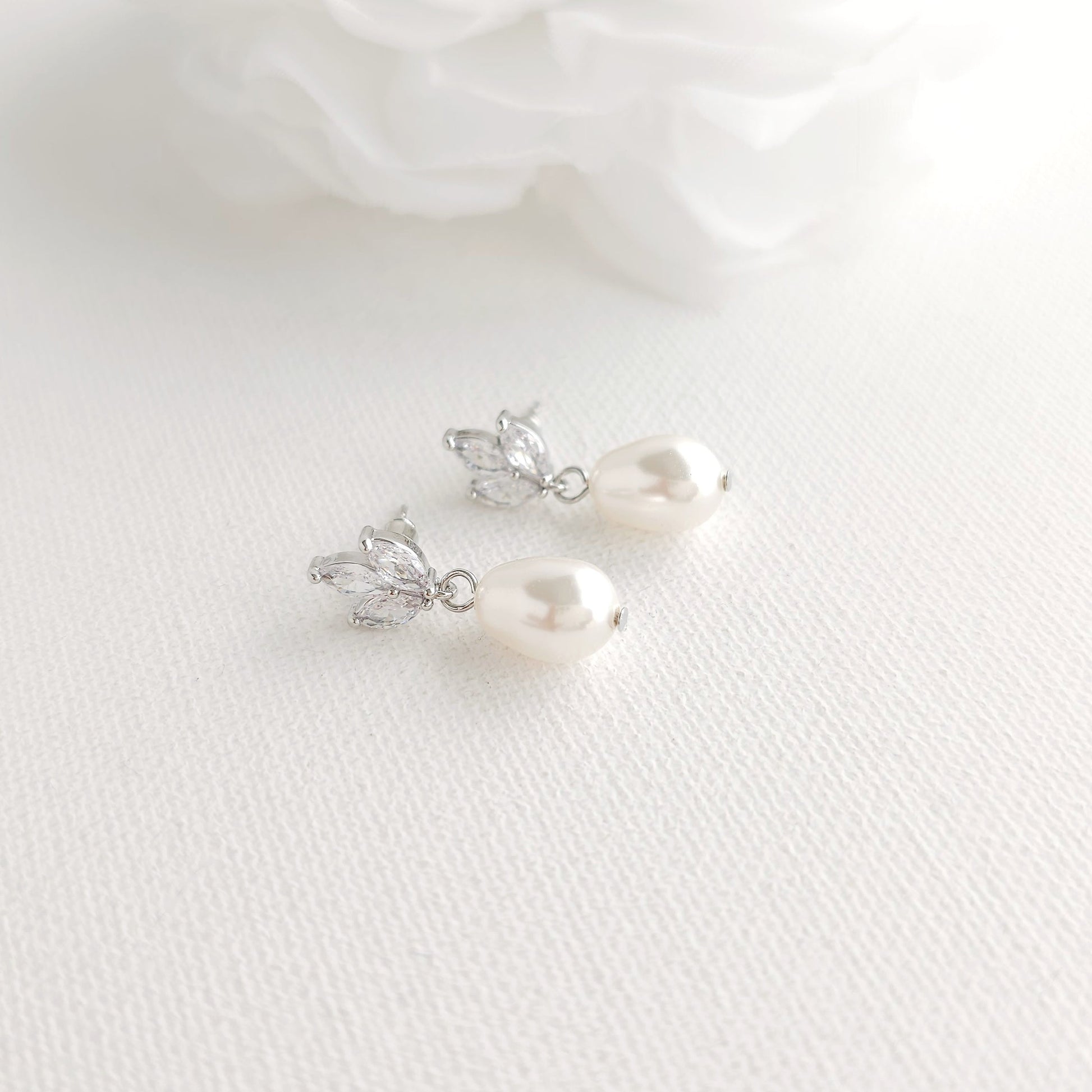 Dainty Teardrop Pearl Earrings with Delicate Leaf-Top for Brides (Silver CZ)- Vera