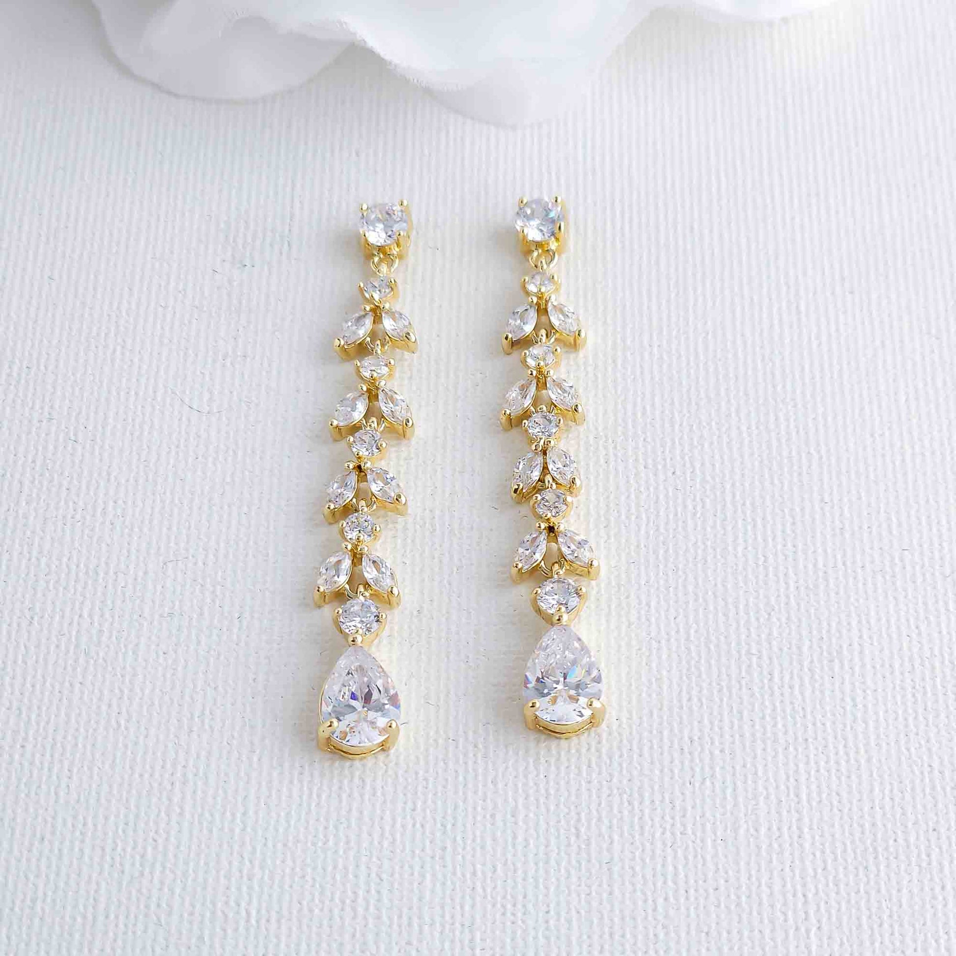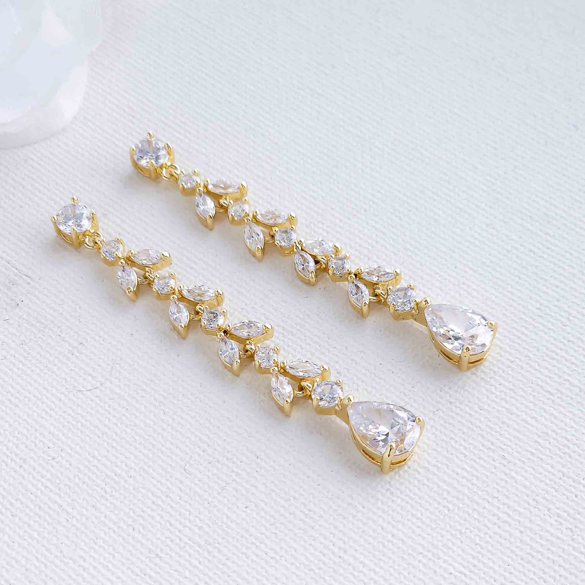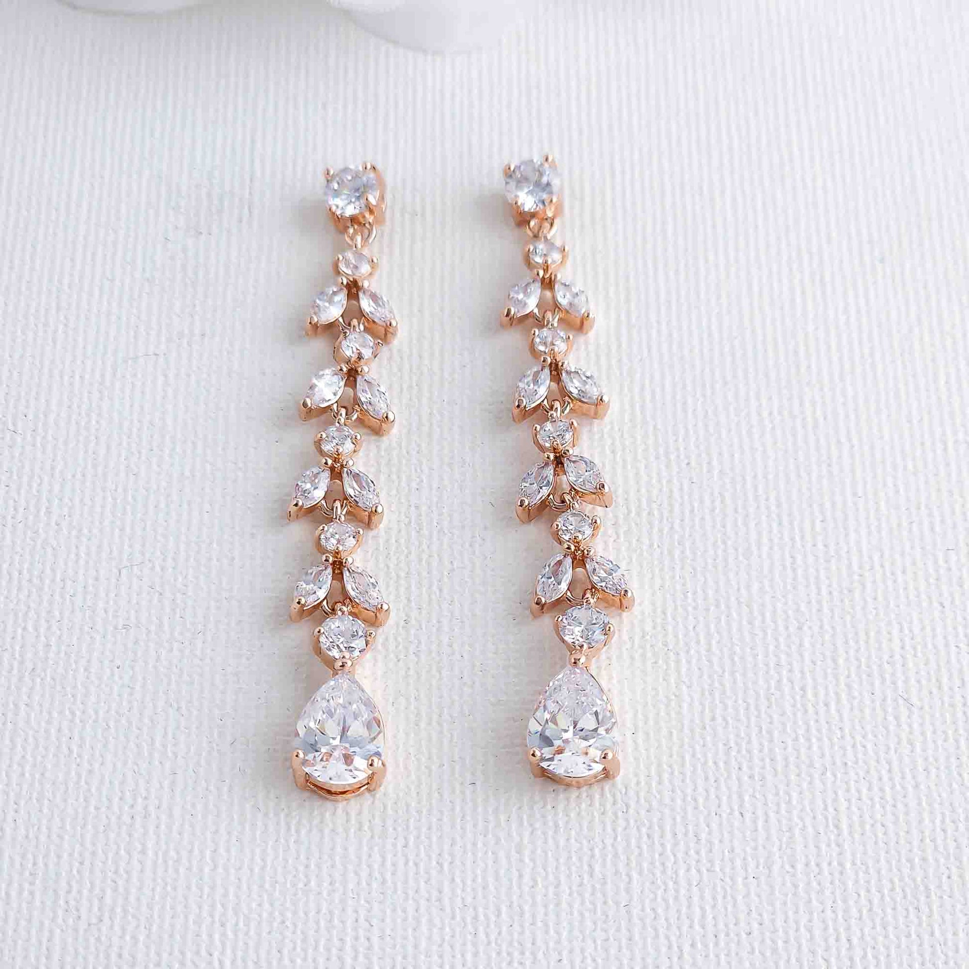 Crafted with shimmering cubic zirconia and rose gold plating, these bridal earrings feature a slender, leaf-shaped design that complements any bridal gown style. Available in both rose gold and gold, these versatile earrings offer a choice to suit your personal style.