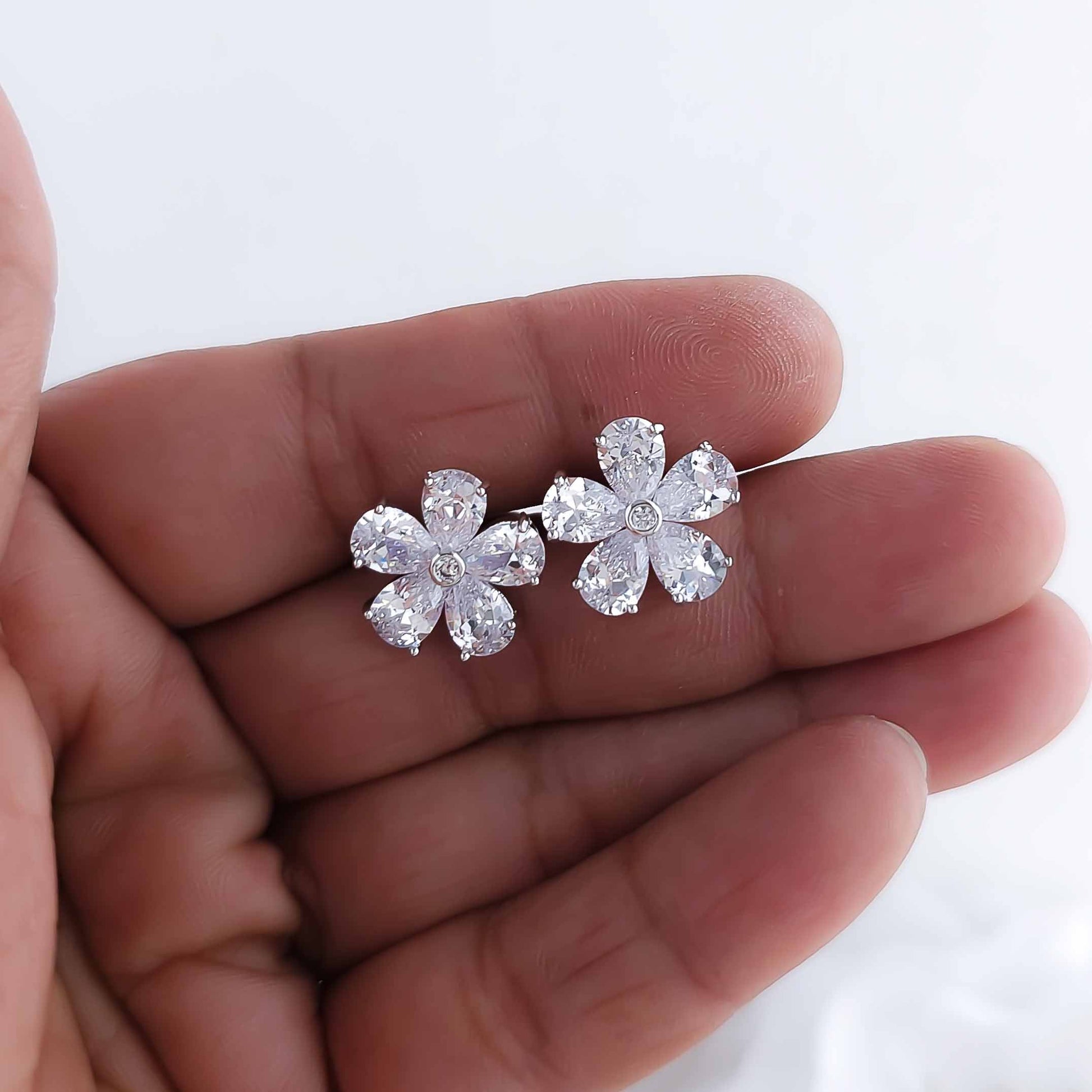 Flower Stud Earrings: The flower petals of the earrings are made of sparkling clear cubic zirconia in a silver finish.
