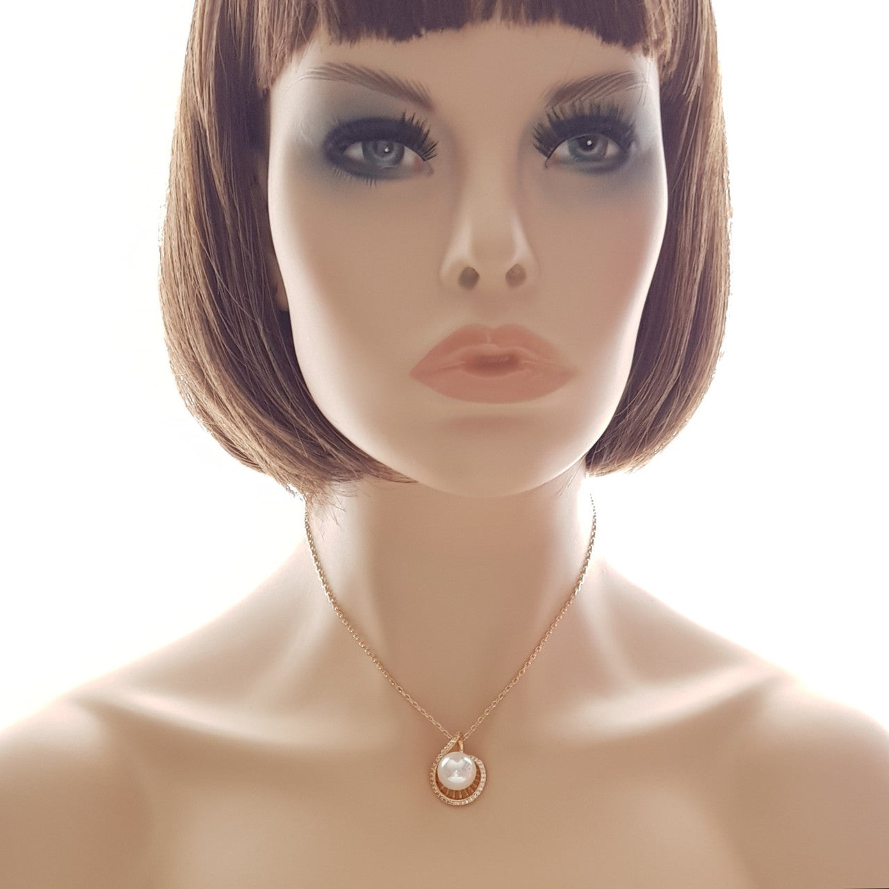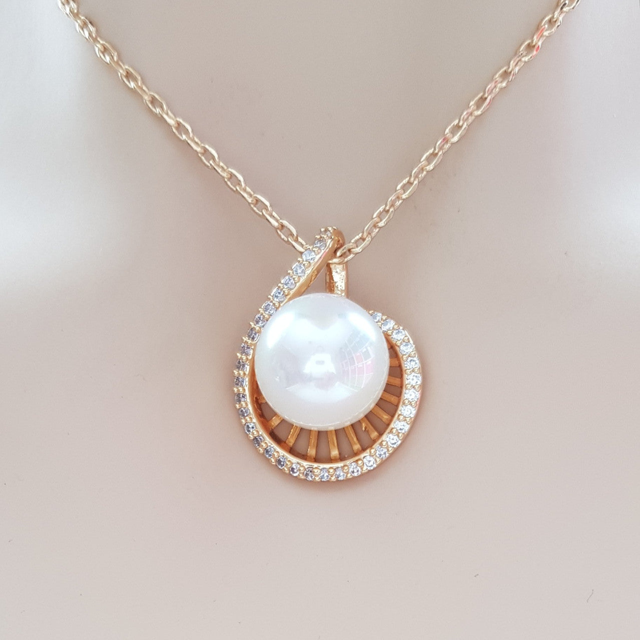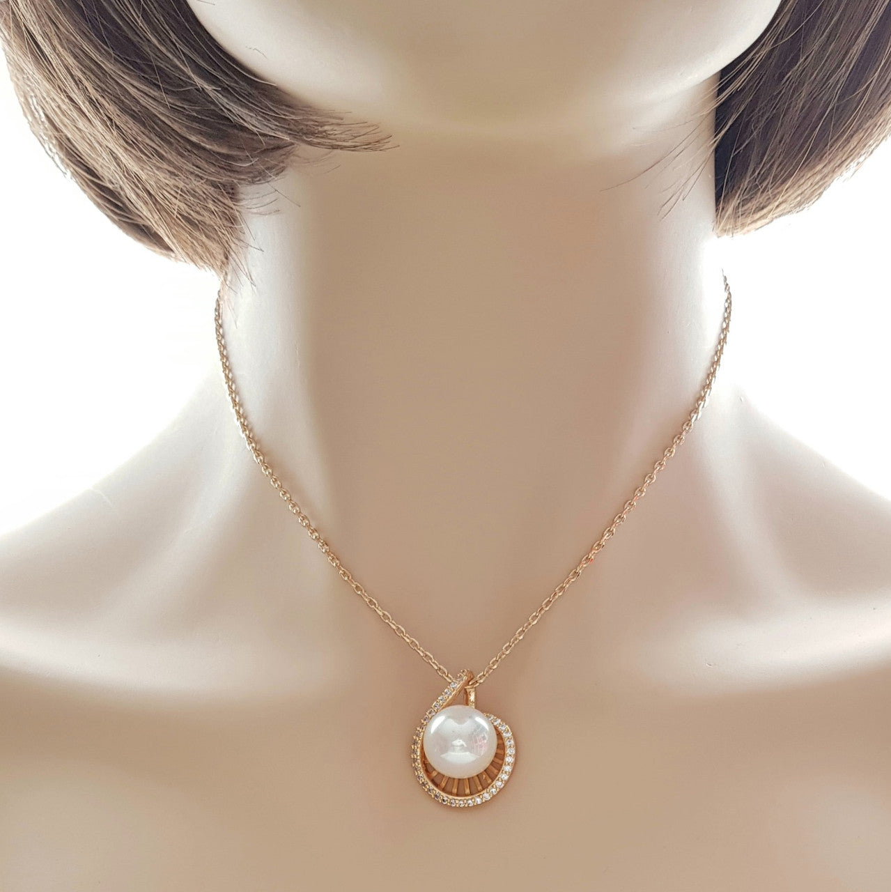 A large pearl necklace in gold that will stand out with any of your outfits. Great to wear for a wedding and events. The gold necklace pendant is made with a large man-made pearl designed in cubic zirconia representing a pearl in the oyster. The pearl pendant is worn with a delicate gold link chain. A great wedding gift to your friends, aunts, moms, and all your loved ones.