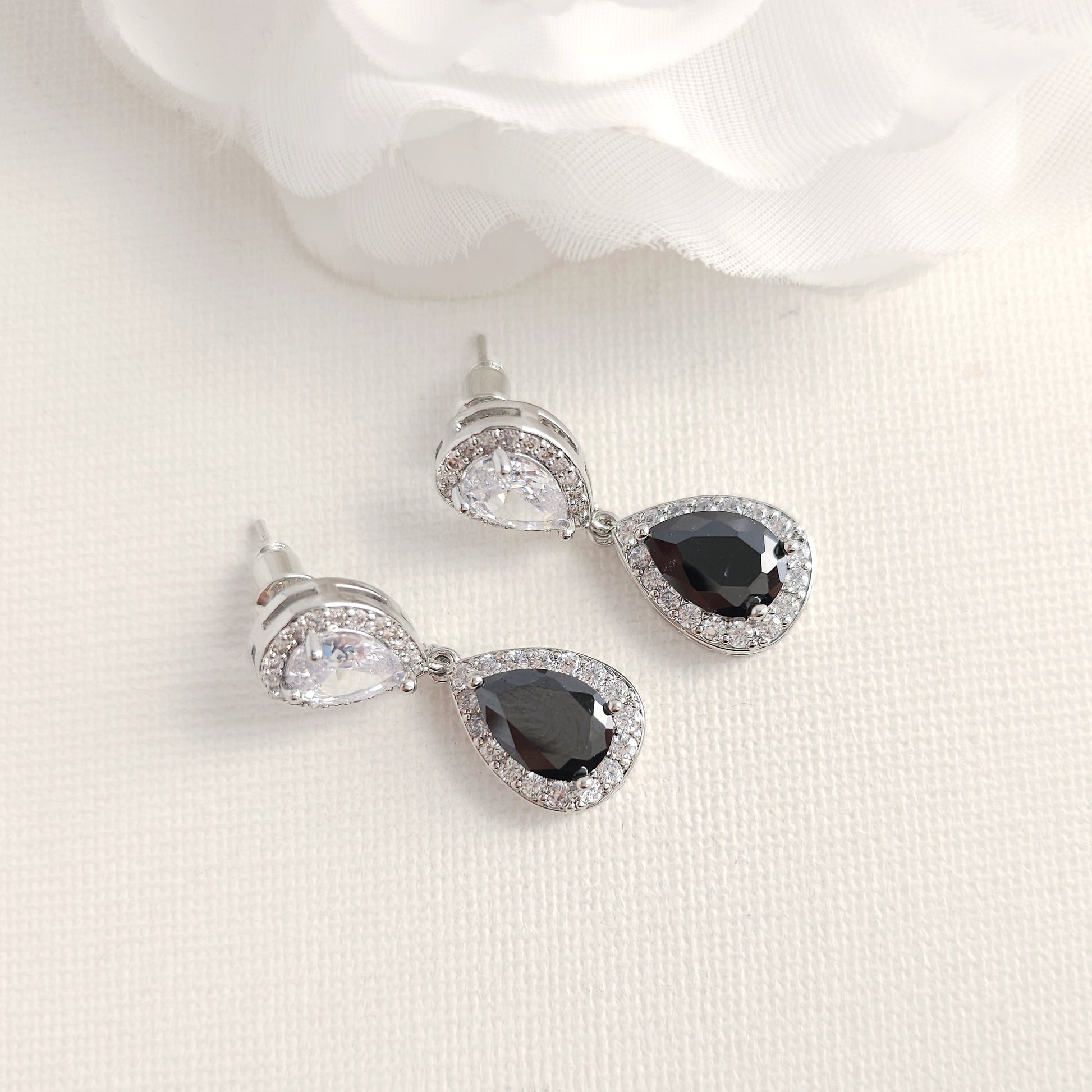 The earrings are available in a Silver, Gold, or Rose Gold finish (all featuring the black CZ drop). We are pleased to offer a Clip-on option for non-pierced ears, and a matching necklace is available upon request.