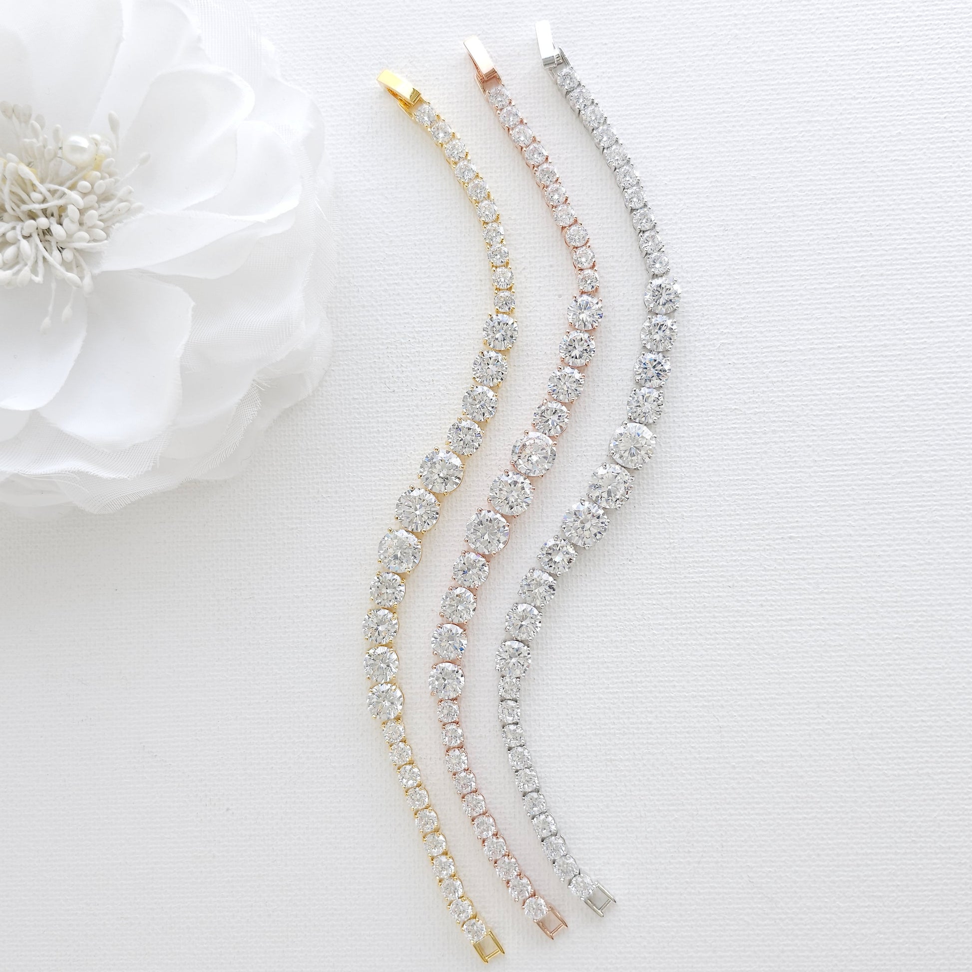 These Nora rose gold bracelet for weddings made with cubic zirconia are a perfect addition to complete your wedding day ensemble. This rose gold wedding bracelet in a classic design are comfortable and looks gorgeous on brides.