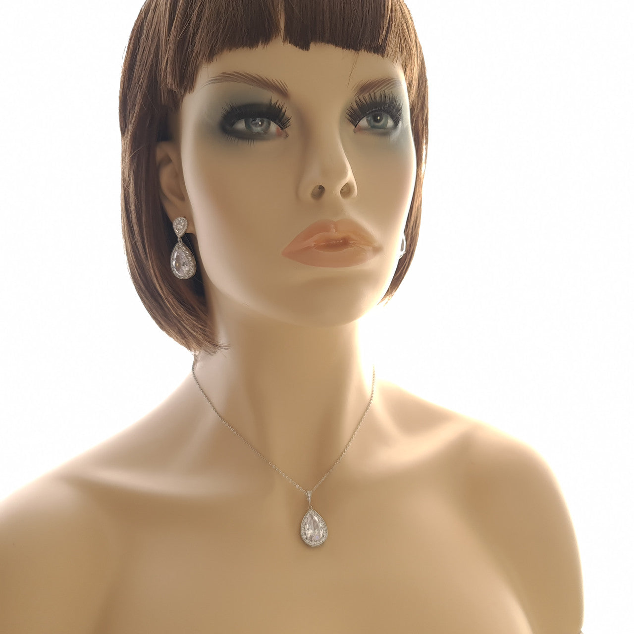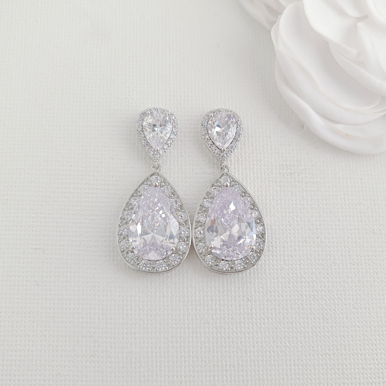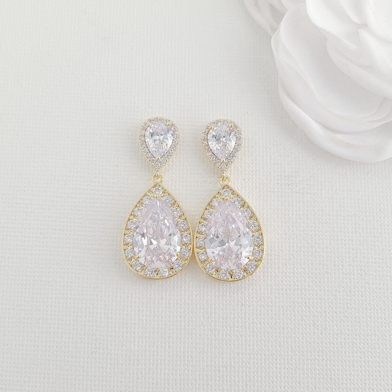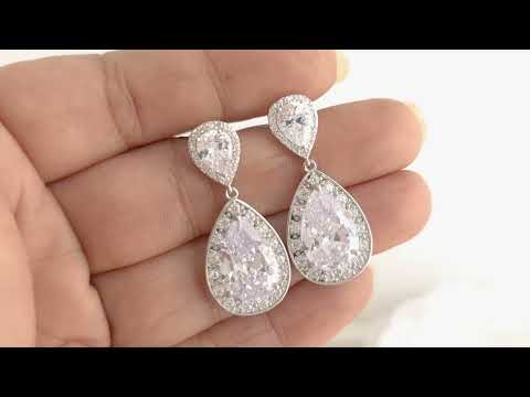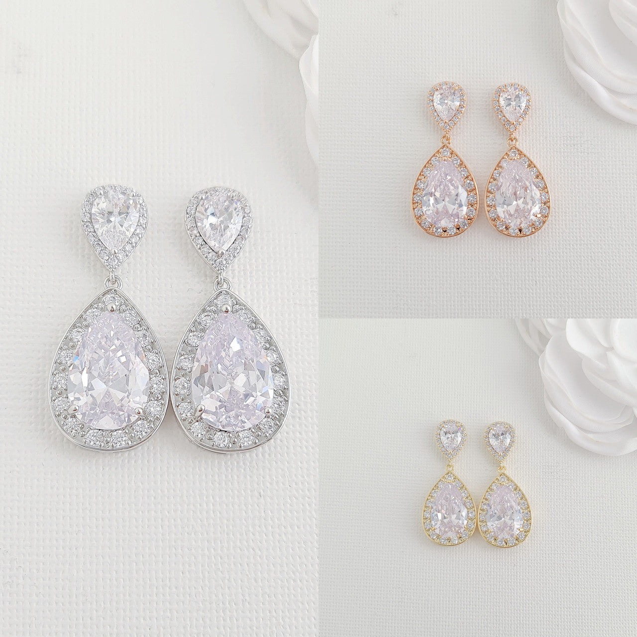 These bridal earrings are made with faceted sparkling cubic zirconia in teardrop shapes. The combination of CZ crystals and rose gold on the earrings will add great style to your traditional bridal look.