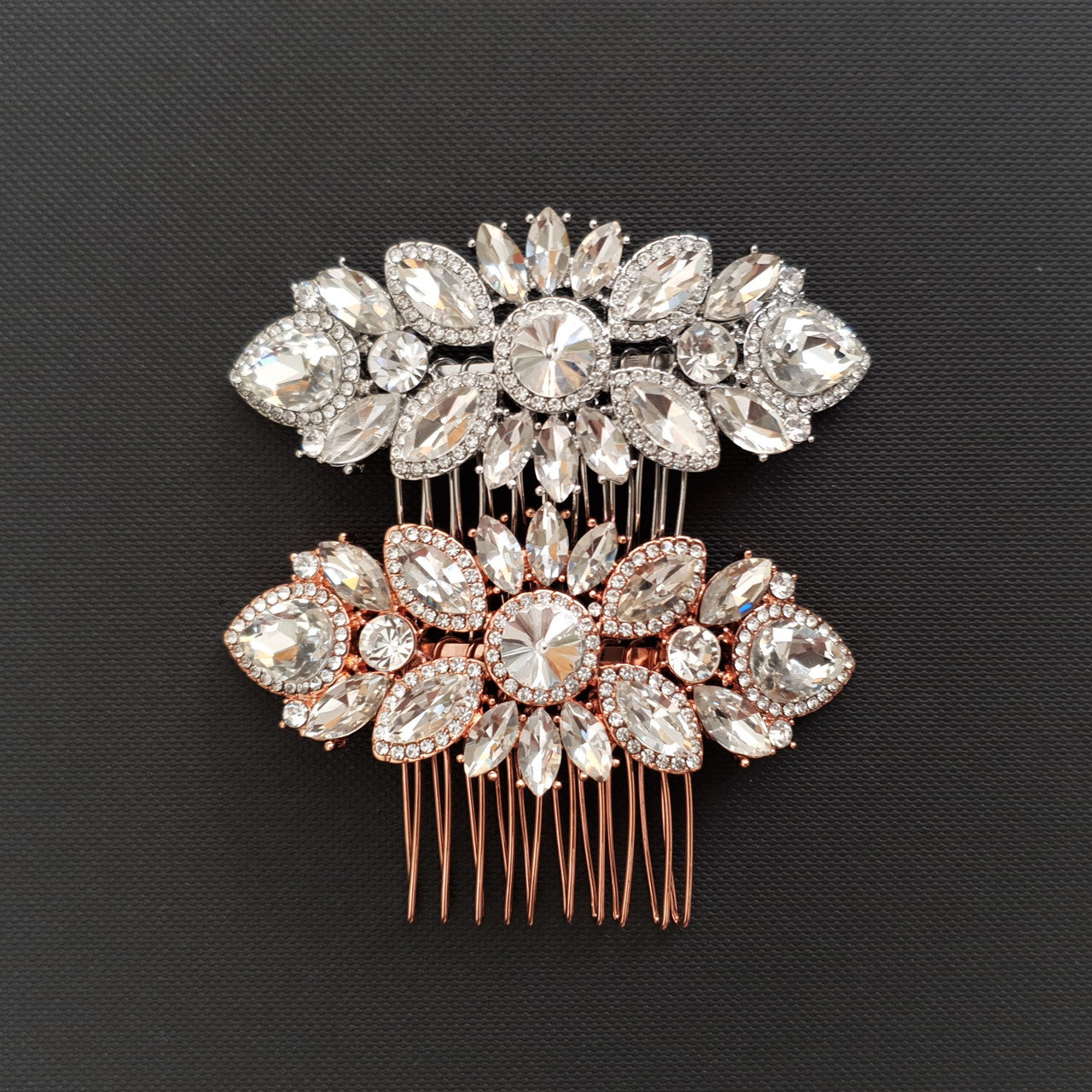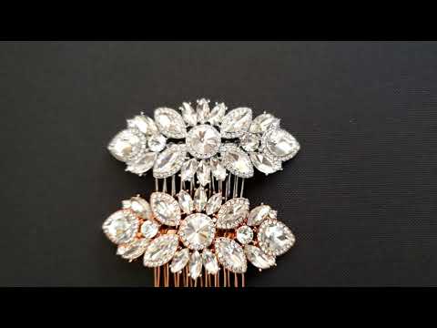 These are super sparkly, rose gold crystal wedding hair combs with round, marquise, and teardrop shape crystals.