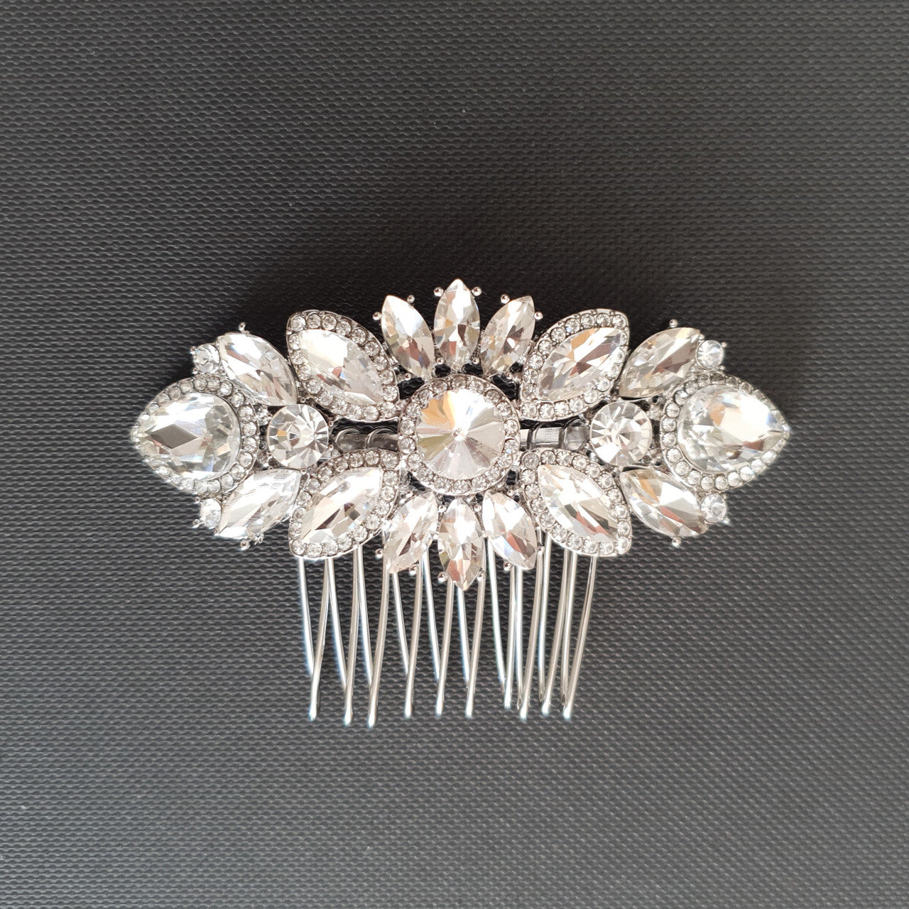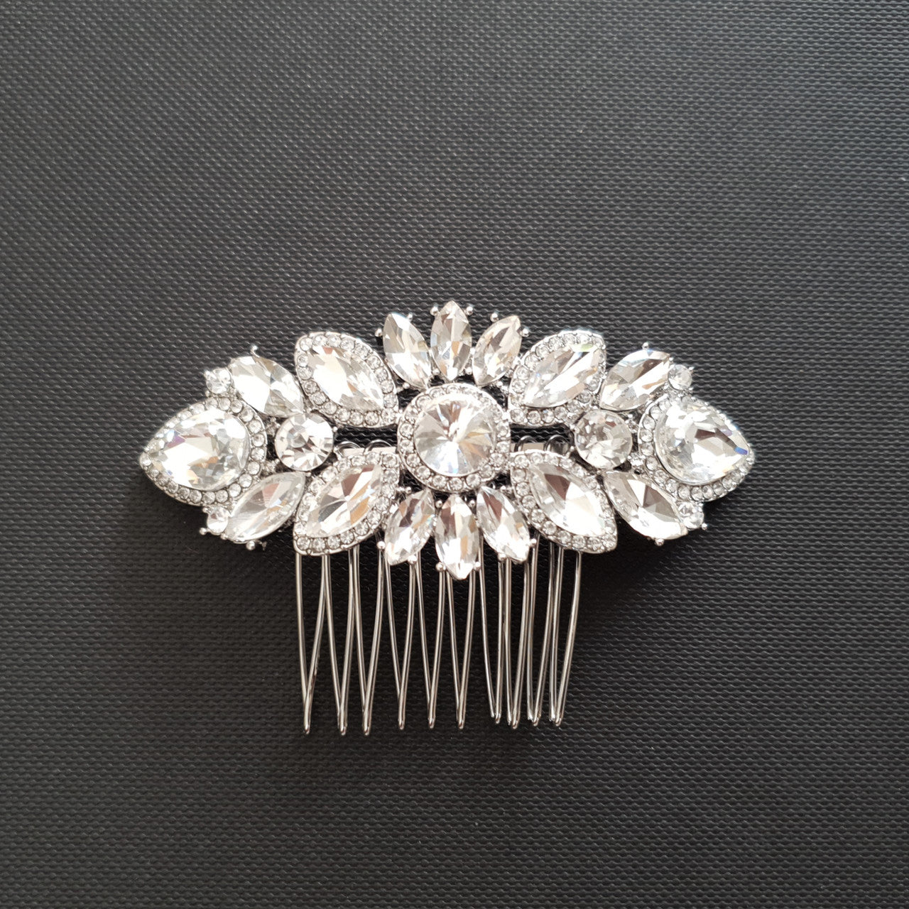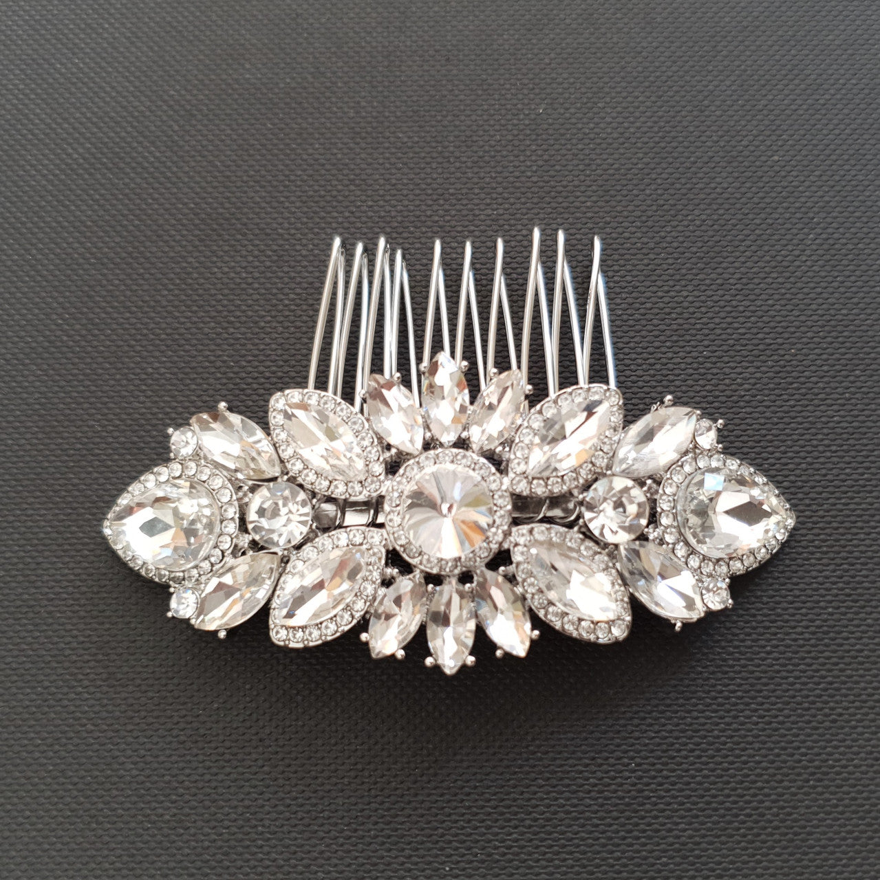 This dainty bridal hair comb is great if you are looking to match your other wedding day accessories or bridal jewellery in the round, marquise, or teardrop shapes to complete your wedding day ensemble.