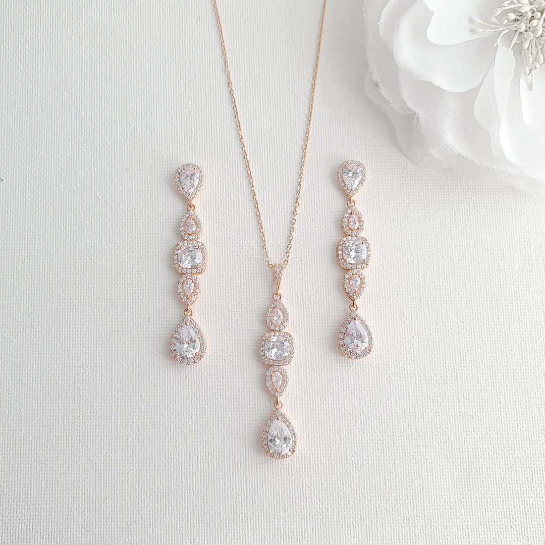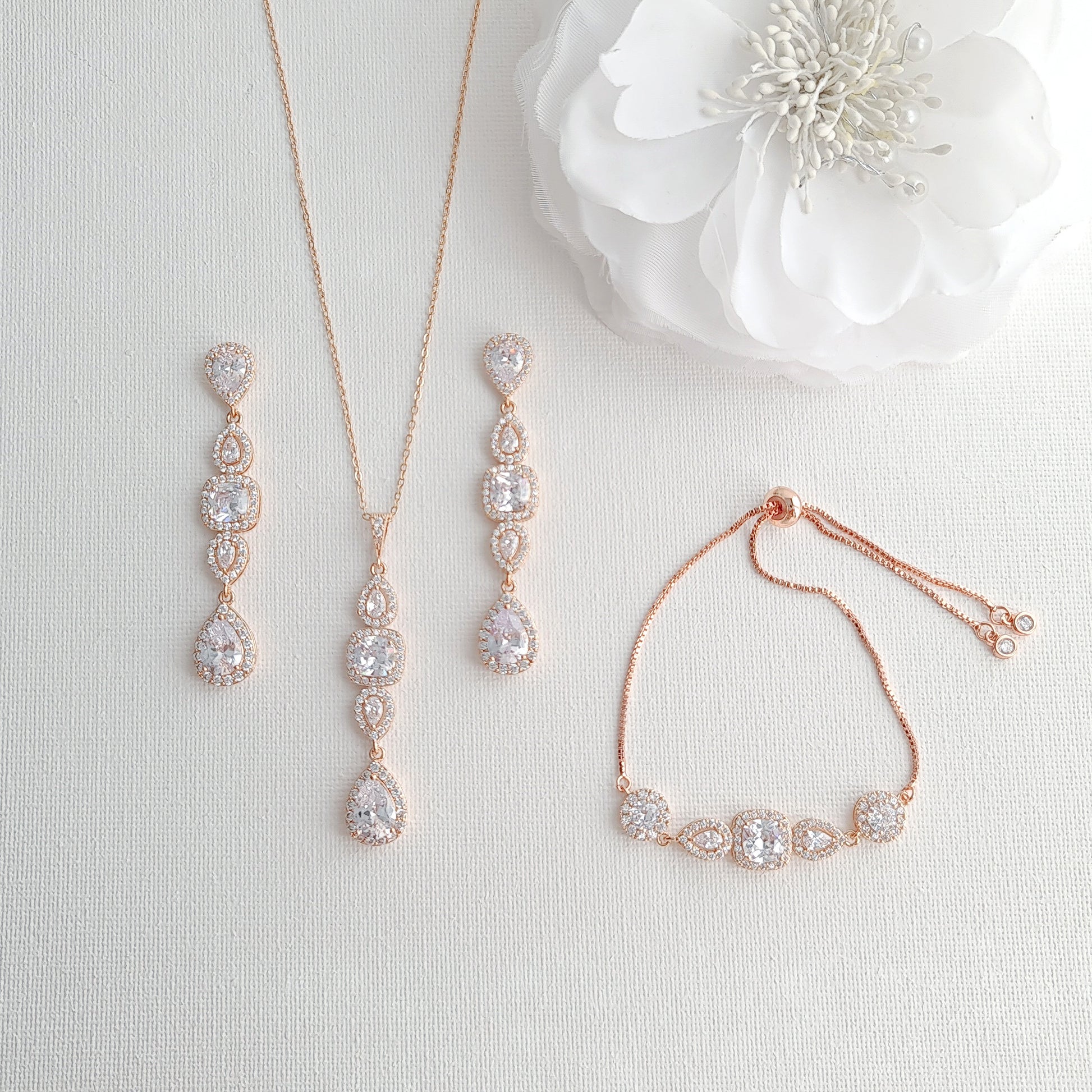 Elegant Rose Gold Jewellery Set for Weddings and Formal Occasions with long Earrings & Pendant Necklace with a Matching Bracelet