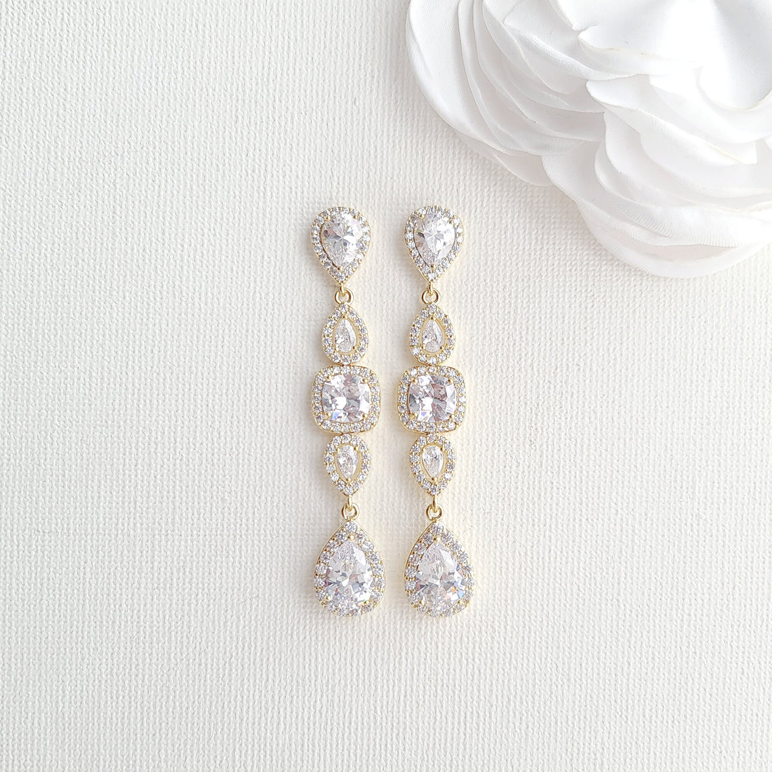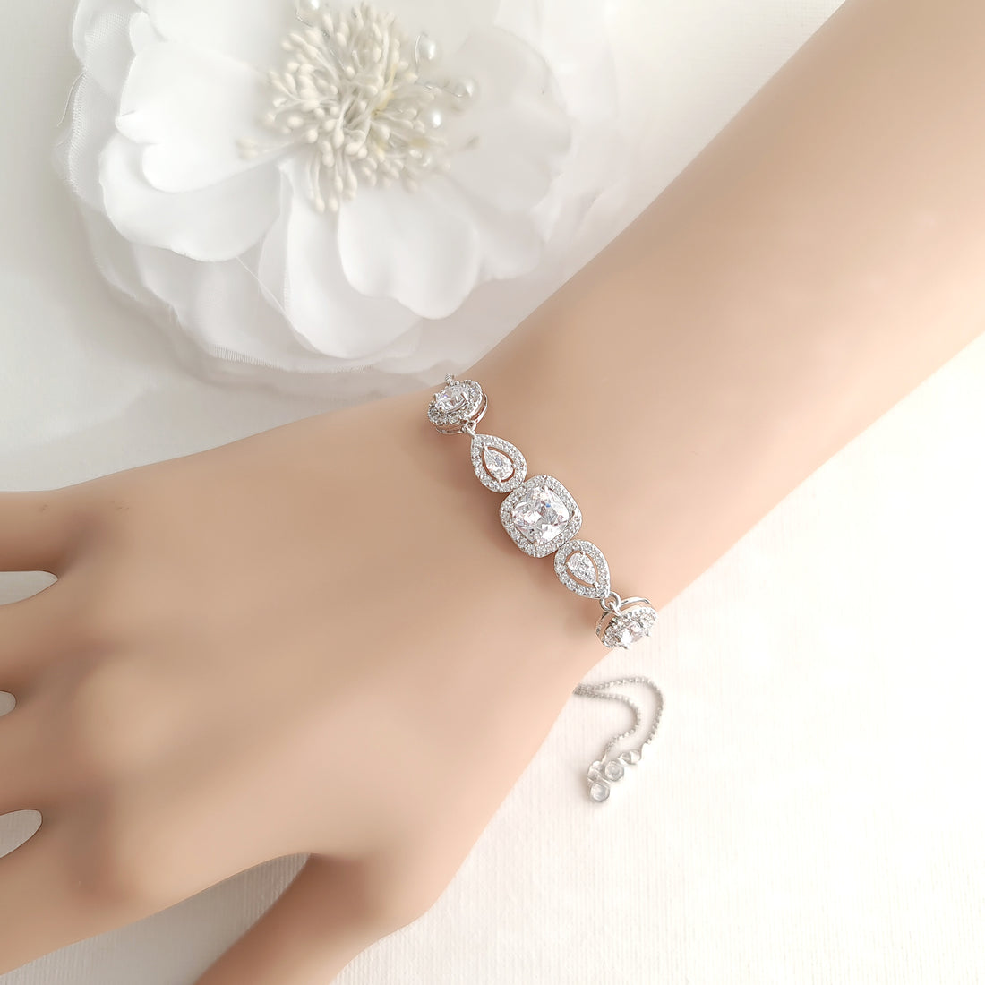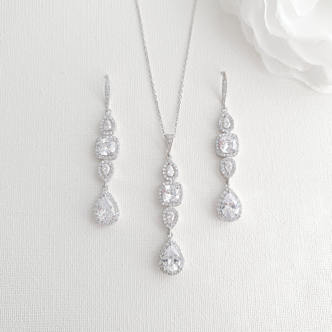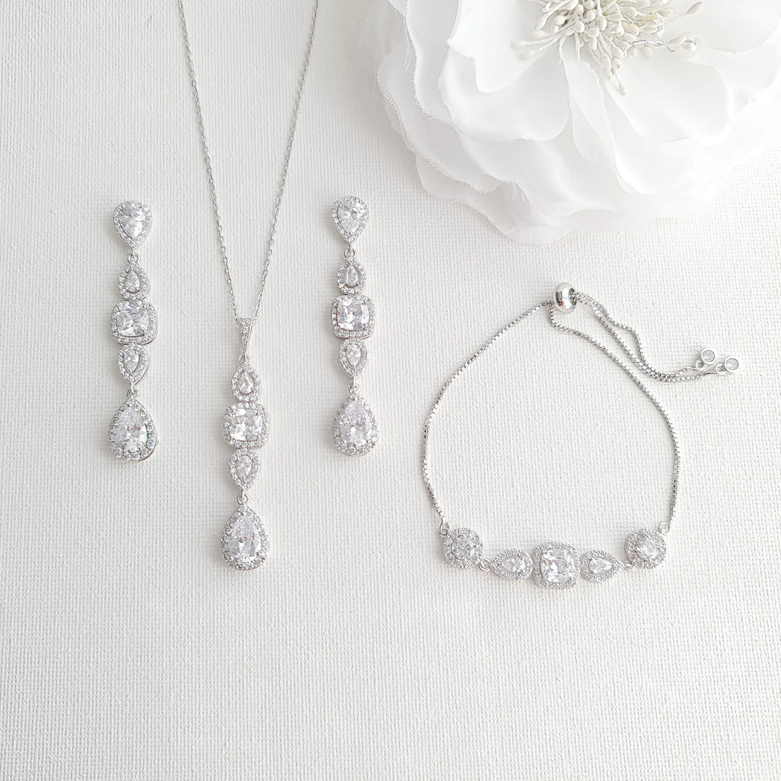 The jewellery set is made of shimmering cubic zirconia in teardrop and cushion-cut square shapes with a hint of rose gold plating. The jewellery set is an excellent choice for brides on their wedding day if dressing up for a formal or a special occasion.