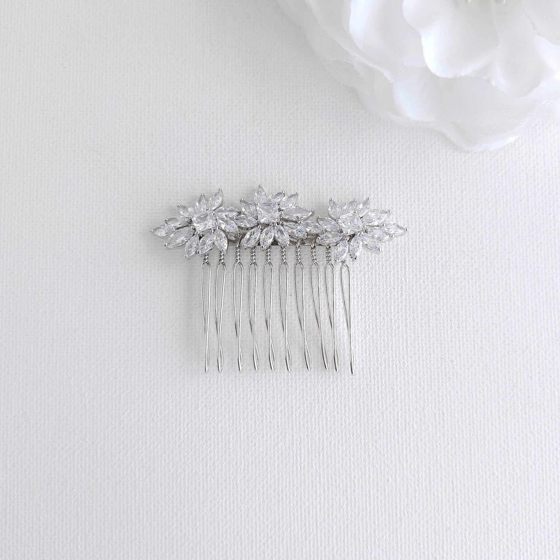 Small Veil Comb: This is a truly Small CZ Wedding Veil Comb. Its size and secure structure make it ideal for placing above your veil or using as an elegant side comb. These elegant alternatives to veil clips, this small hair comb keeps your veil perfectly positioned without adding bulk.