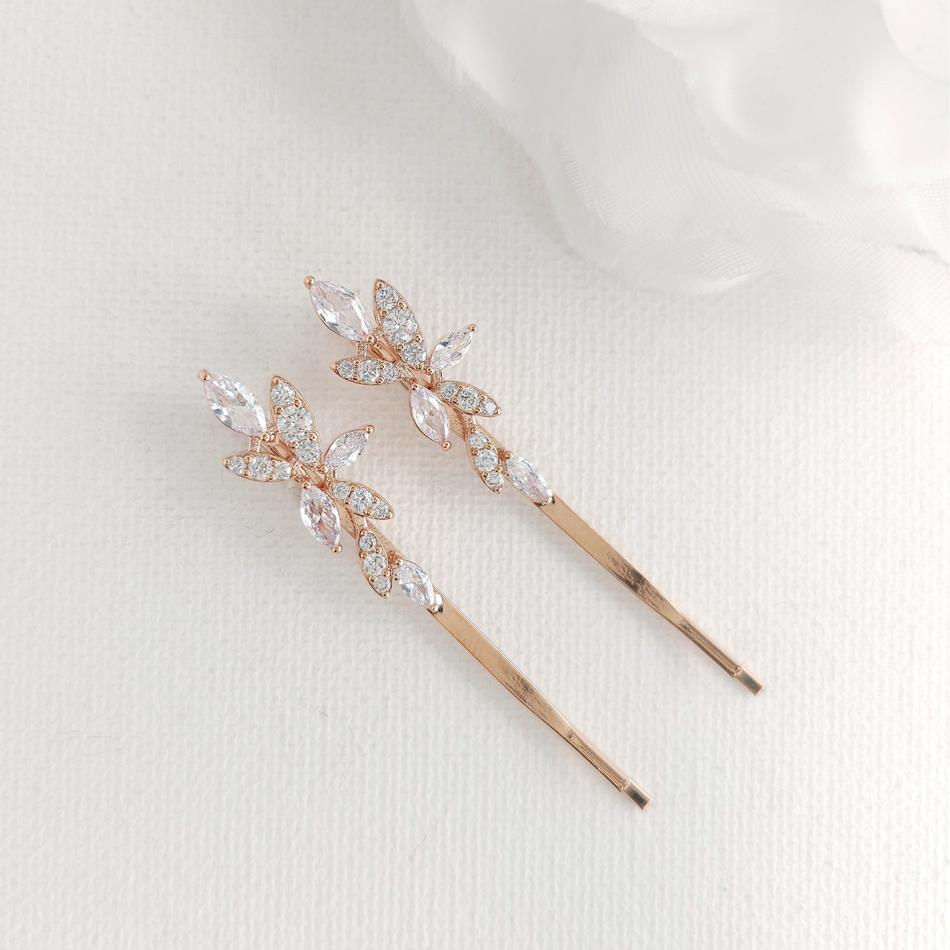 Rose Gold Leaf Bridal Hair Pin Set | Marquise CZ Slide for Bridesmaids & Flower Girls - Thea