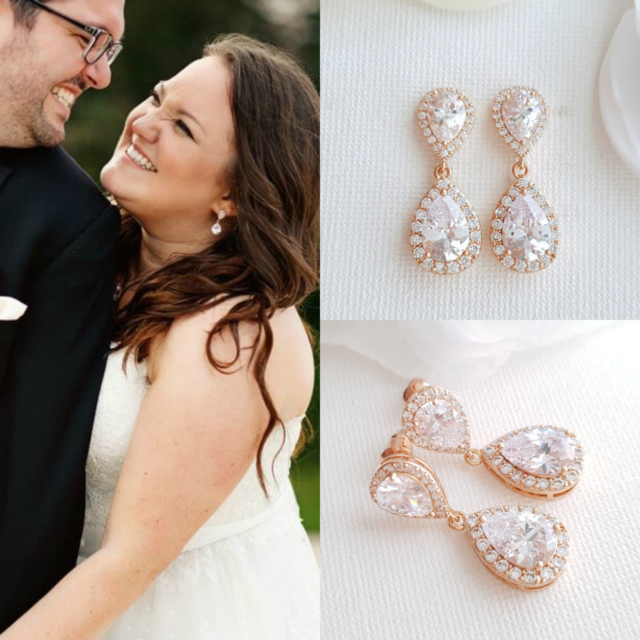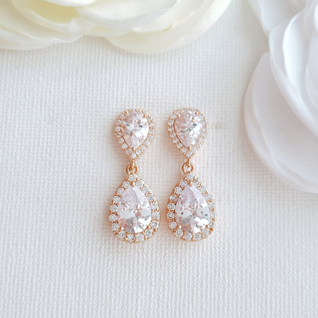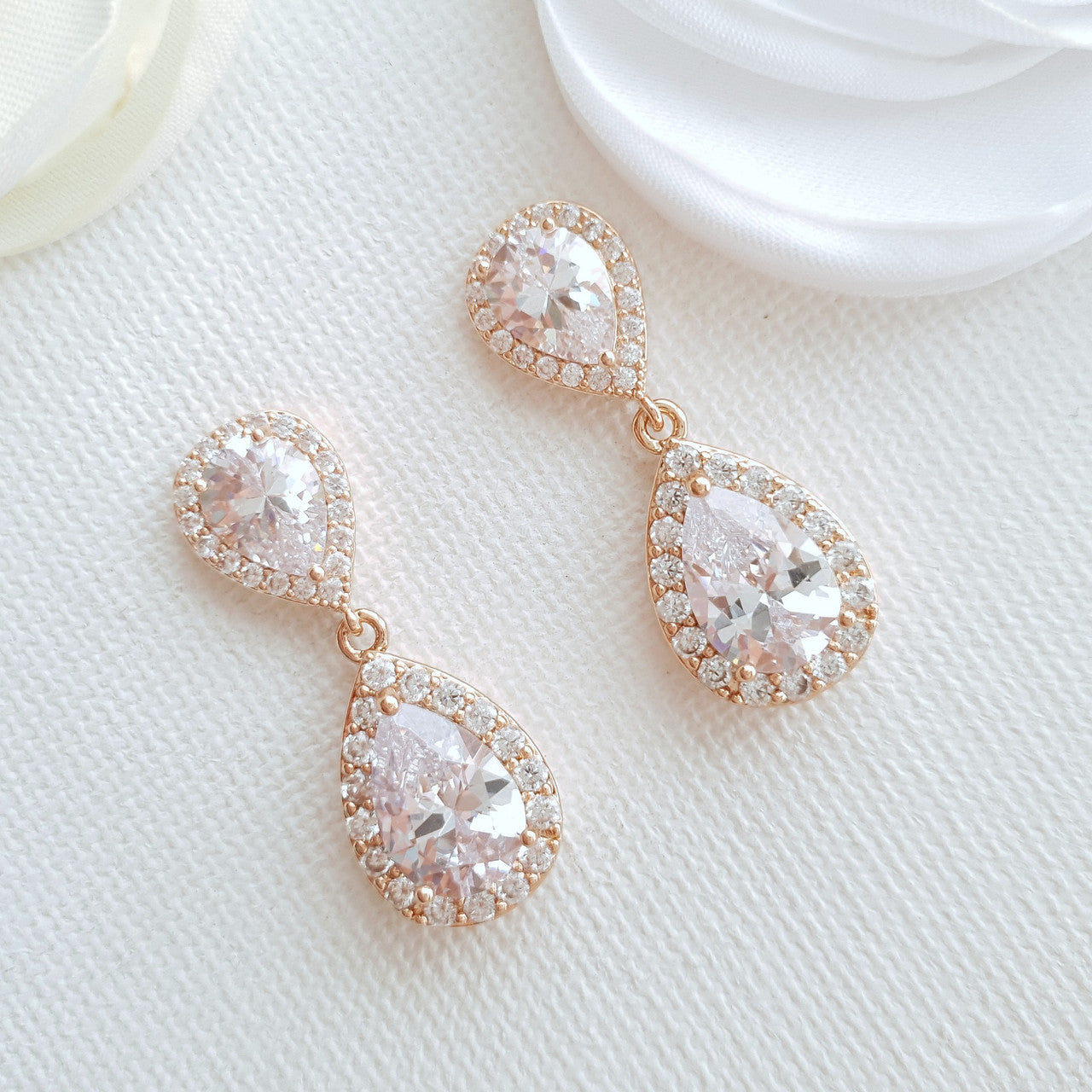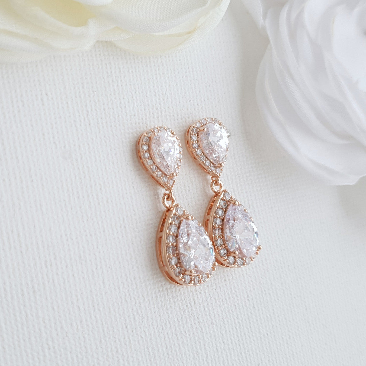 Cubic Zirconia Rose Gold Teardrop Earrings for Brides and Bridesmaids.