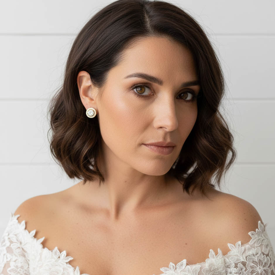 Simple and elegant round stud earrings are a great choice for brides and a handy piece of earring that every woman should have in her collection. These beautiful small stud earrings are sparkly and are made with cubic zirconia. A versatile pair of round earring that can be worn with your bridal gown, bridesmaids dress or any outfit with ease to add a shimmering look. This silver-tone earring in rhodium plated cubic zirconia earrings is measure 1.1 cms or .43 inches. An affordable pair of earrings that you can add to your collection today!
