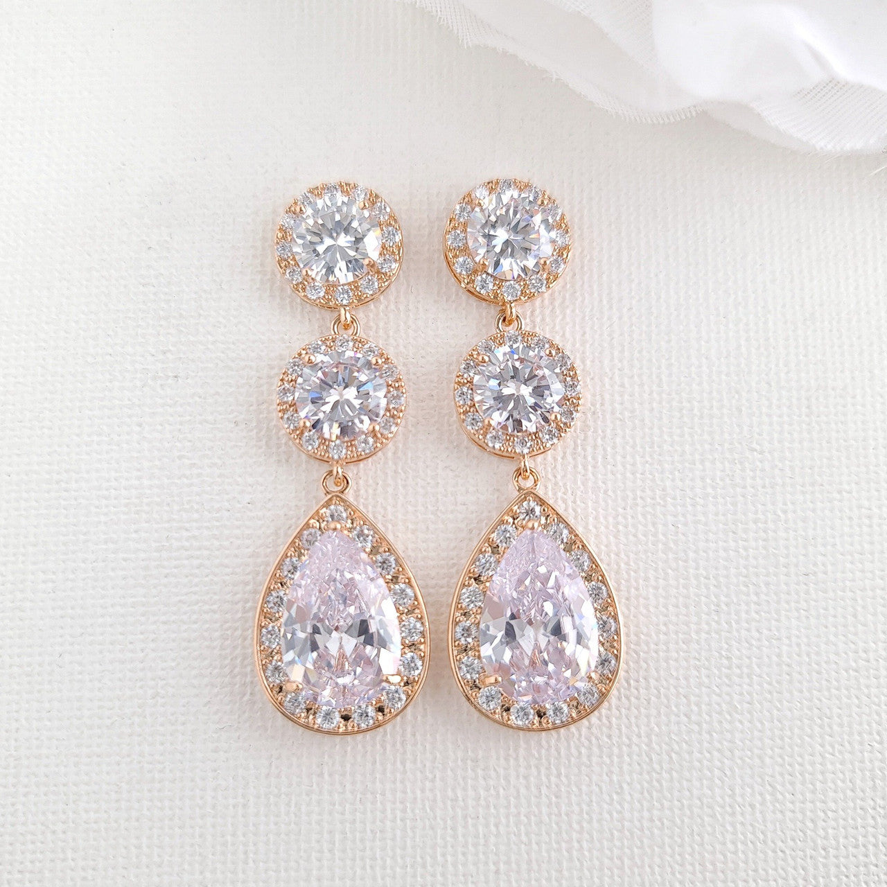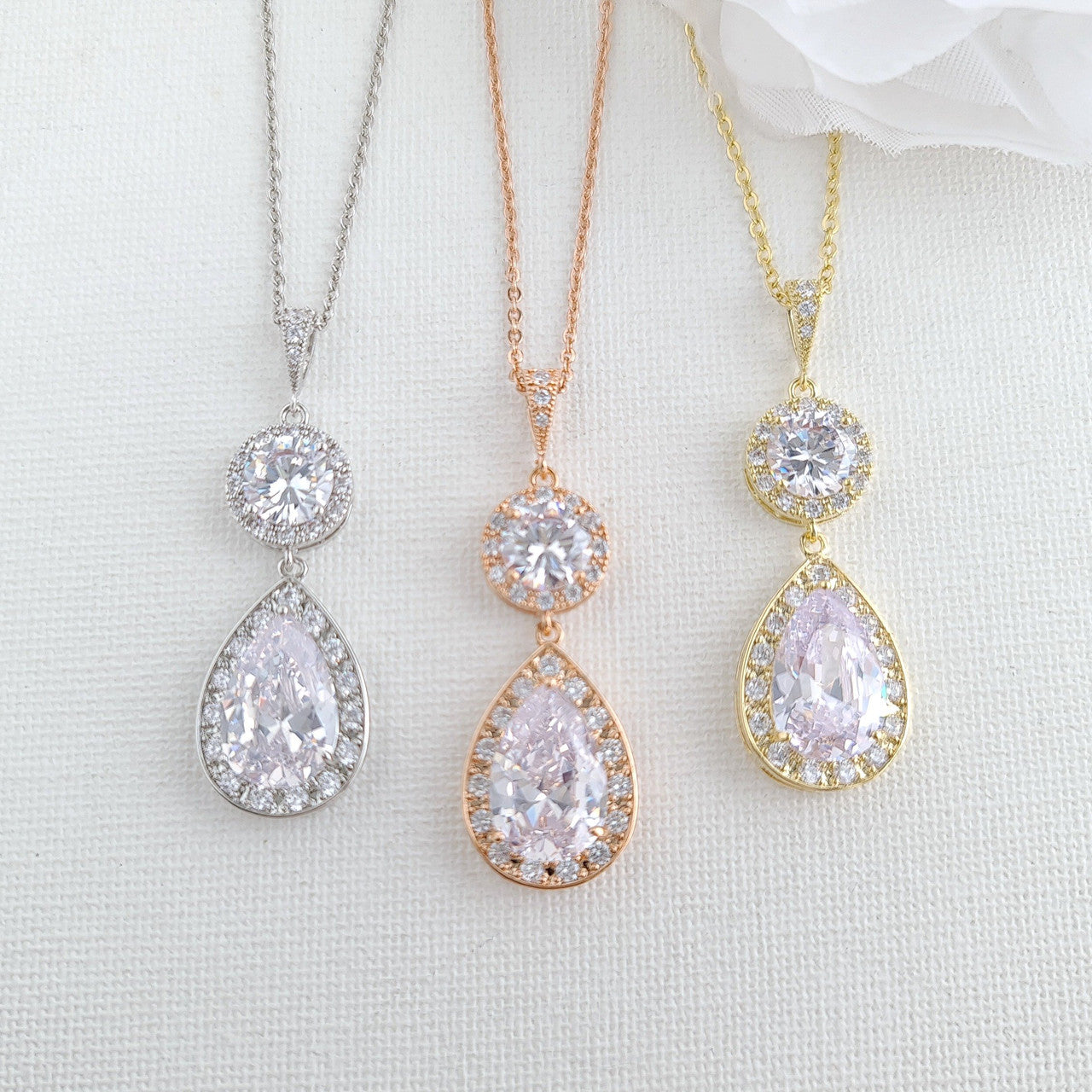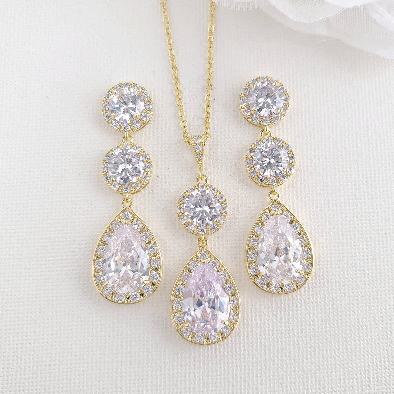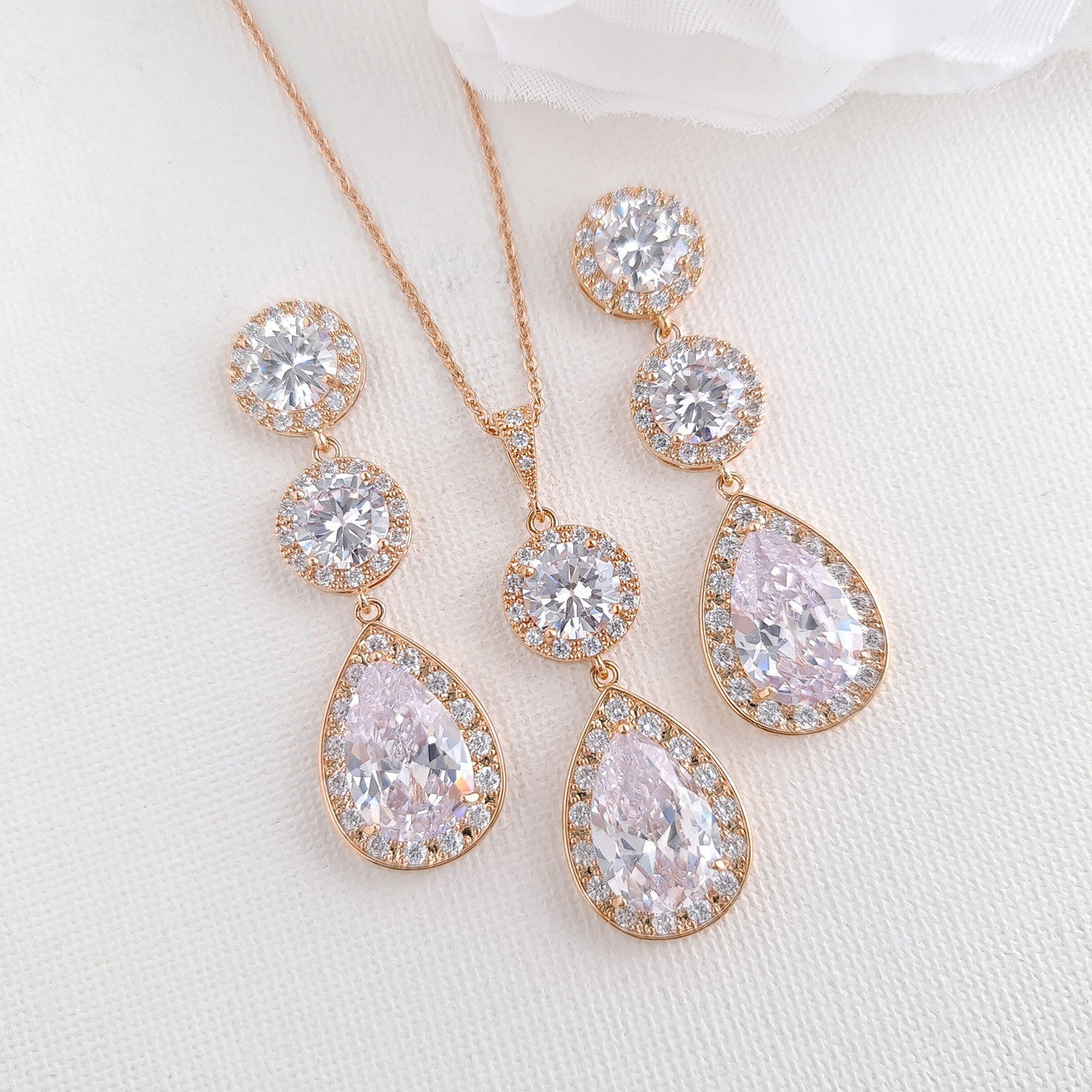 The earrings are made with multi-faceted round and teardrop clear cubic zirconia crystals making it super sparkly, This bride jewellery set is available in three finishes of silver, rose gold, gold tones.
