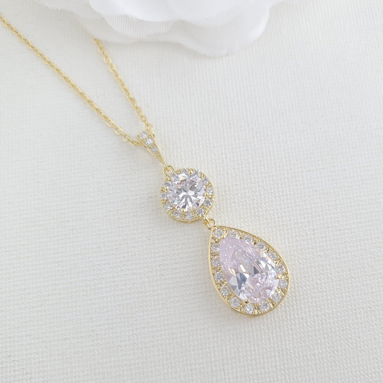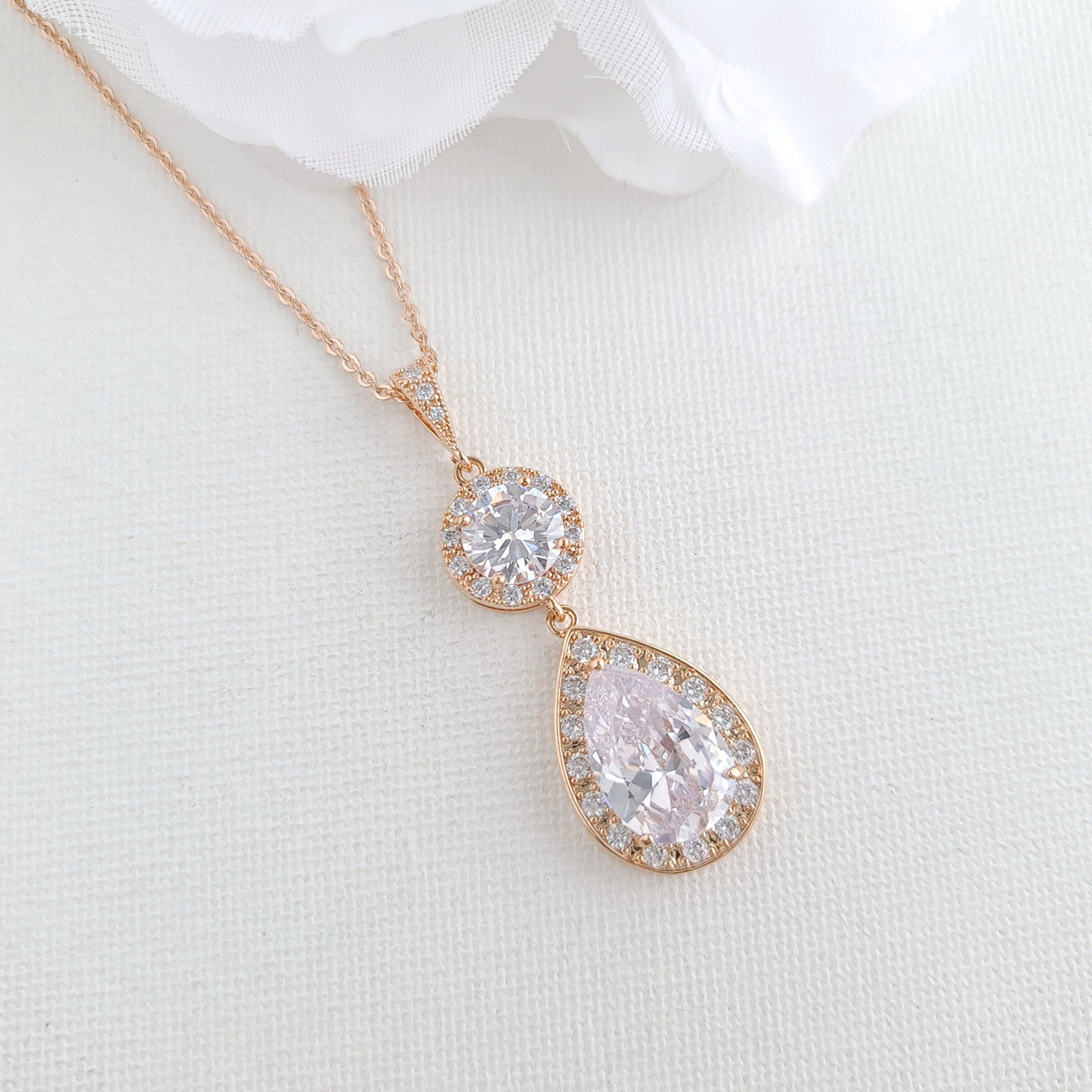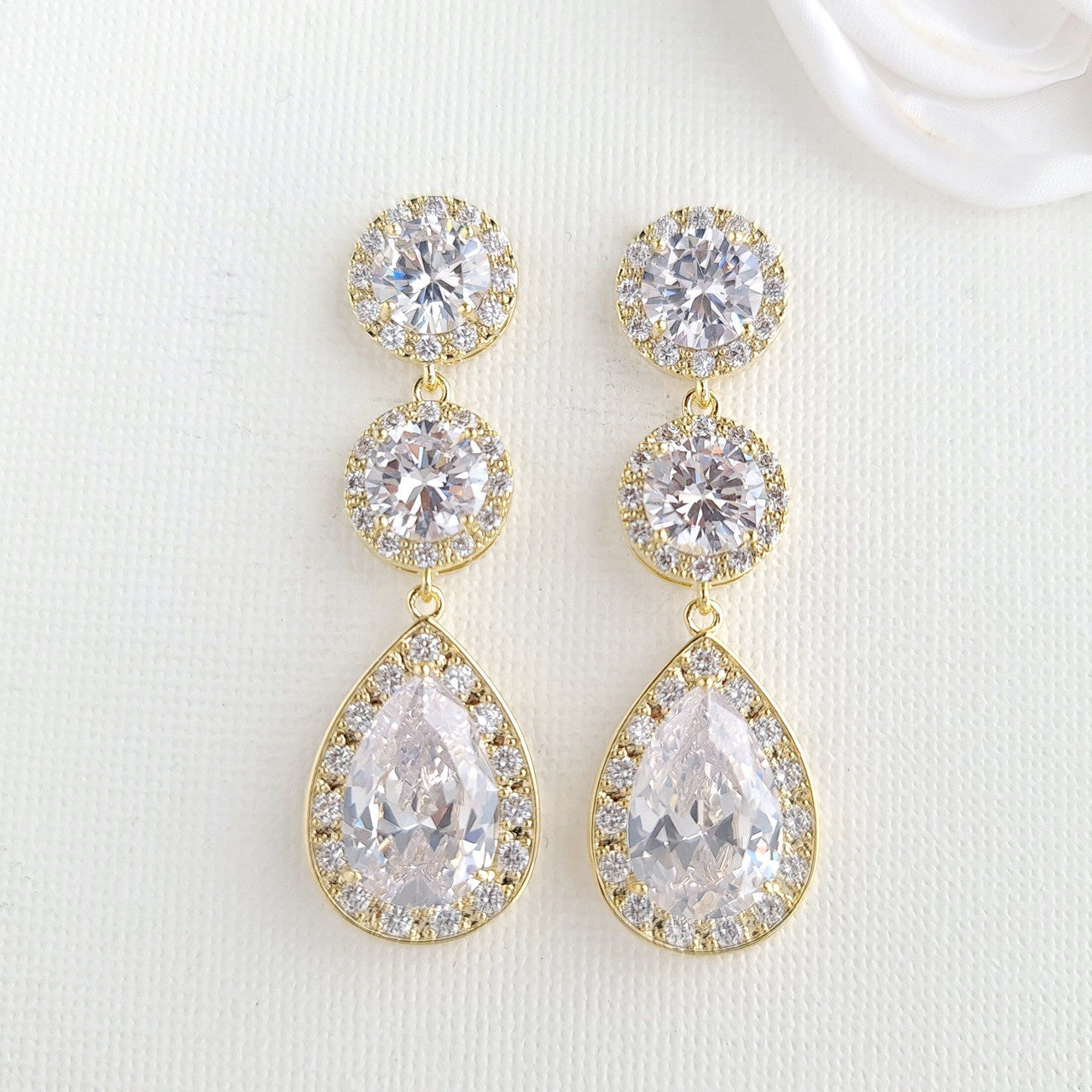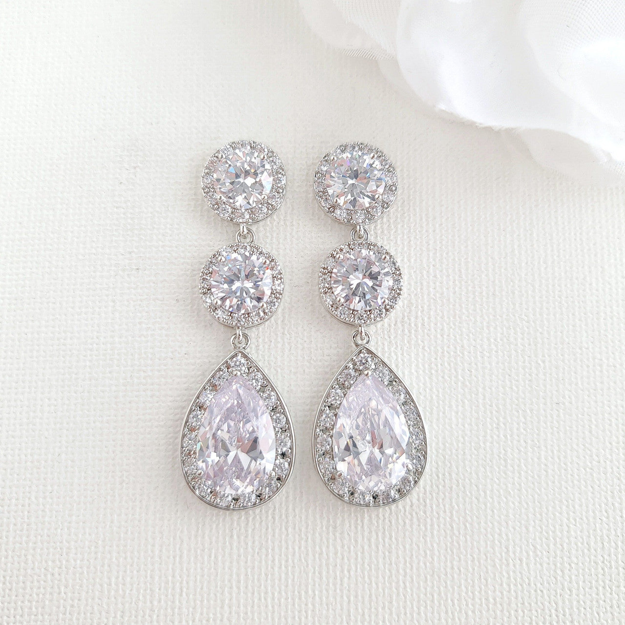 The earrings are made with multi-faceted round and teardrop clear cubic zirconia crystals making it super sparkly, This bride jewellery set is available in three finishes of silver, rose gold, gold tones.