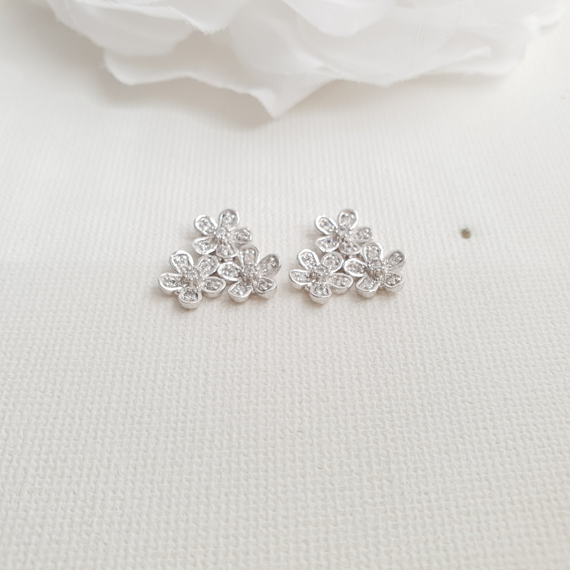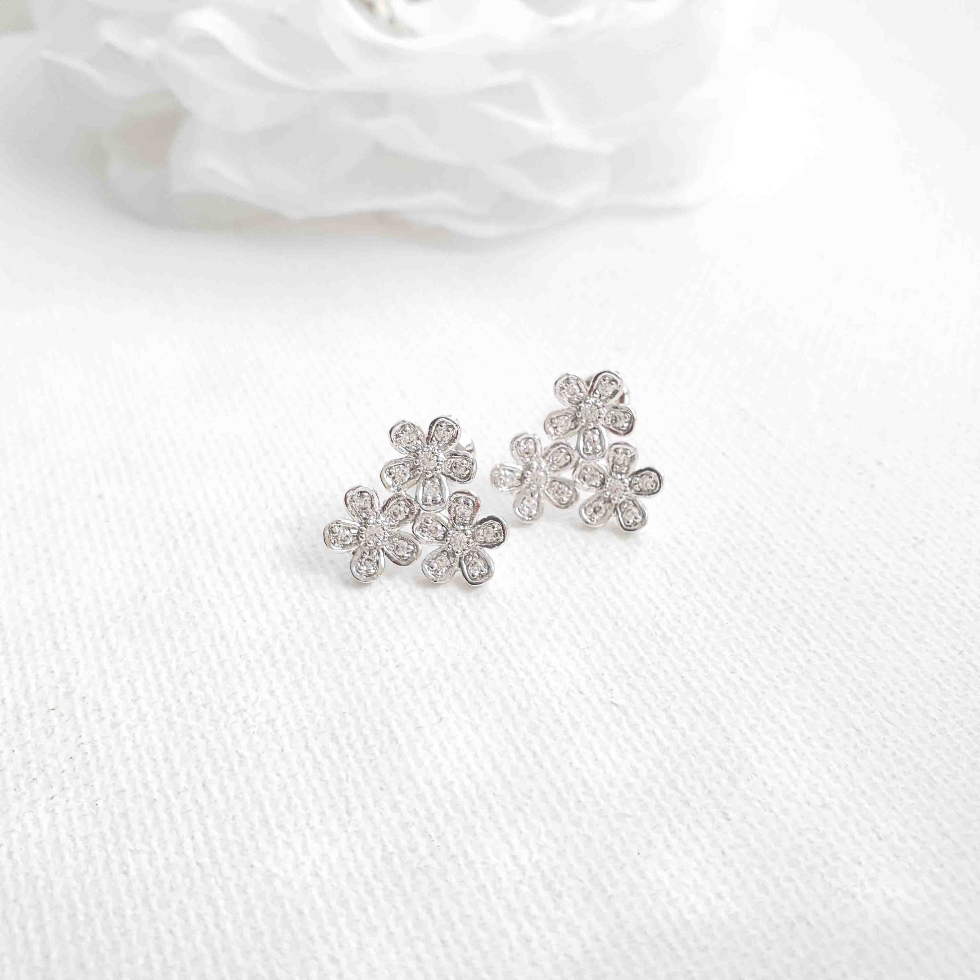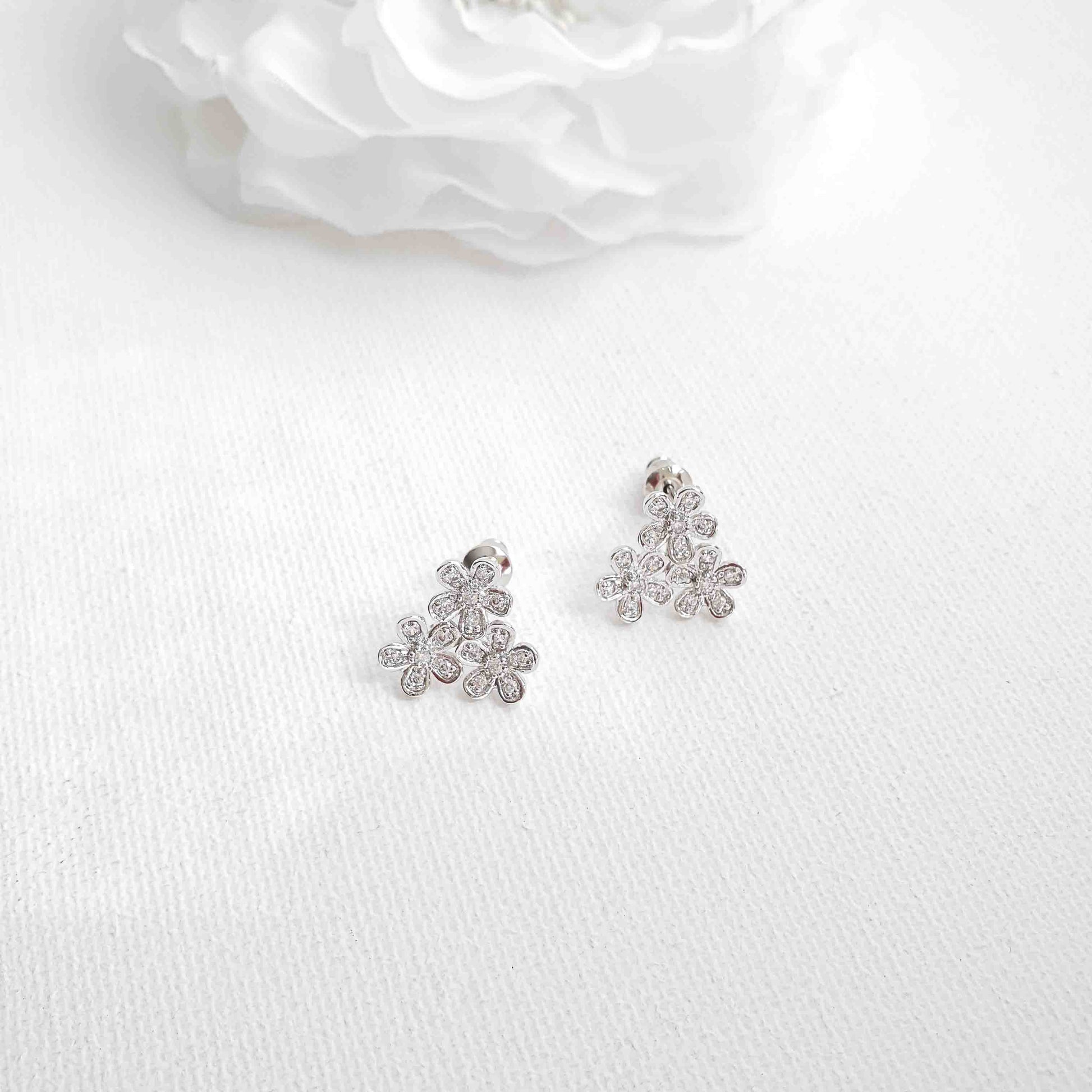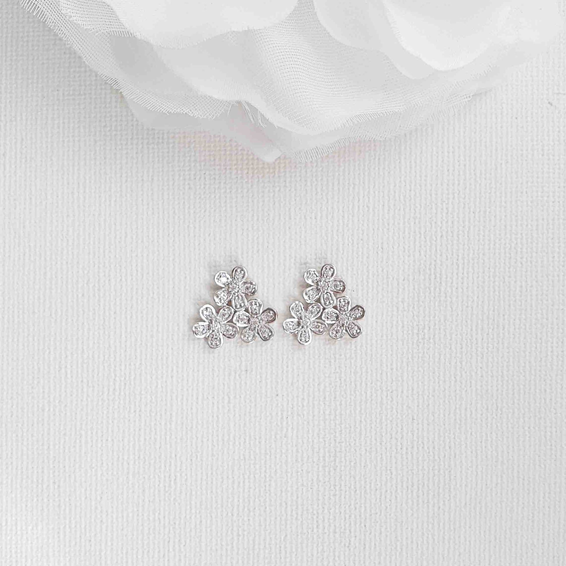 Choose Charlotte silver flower earrings for a delicate and elegant look. The beautifully crafted silver flower stud earrings feature three flowers with petals encrusted with sparkly cubic zirconia.