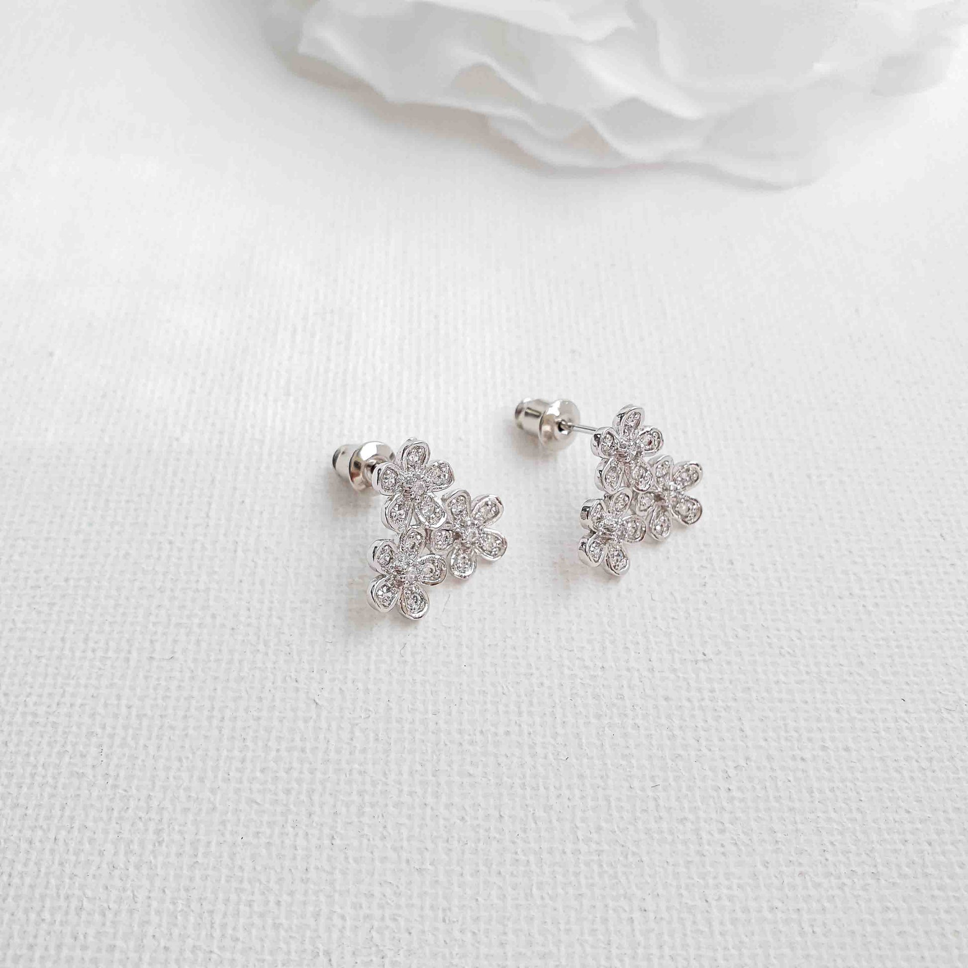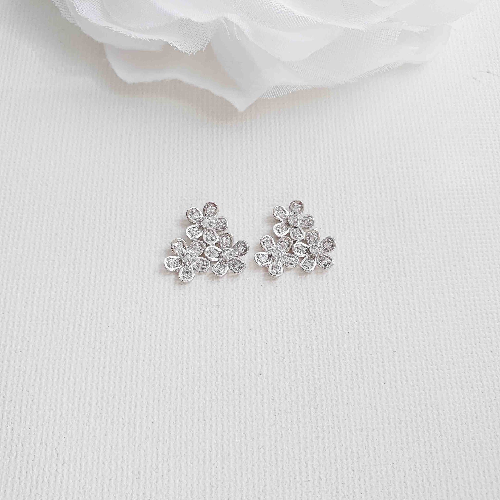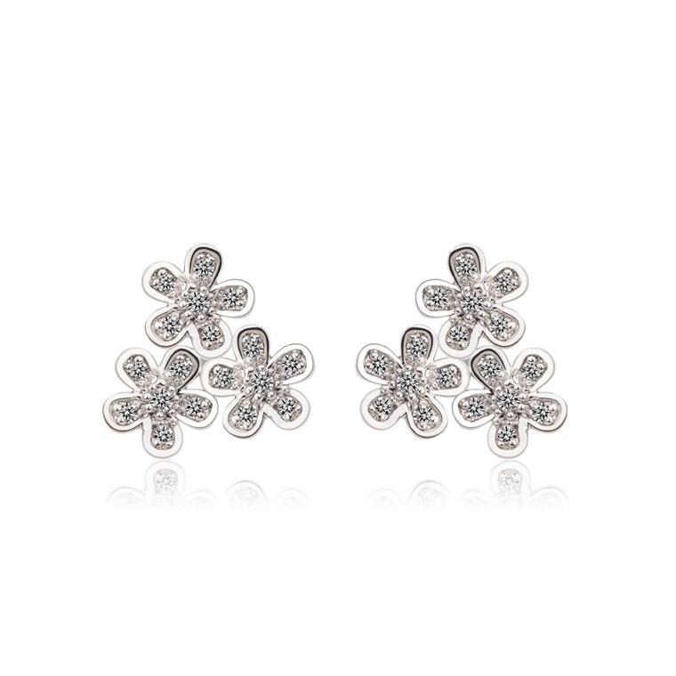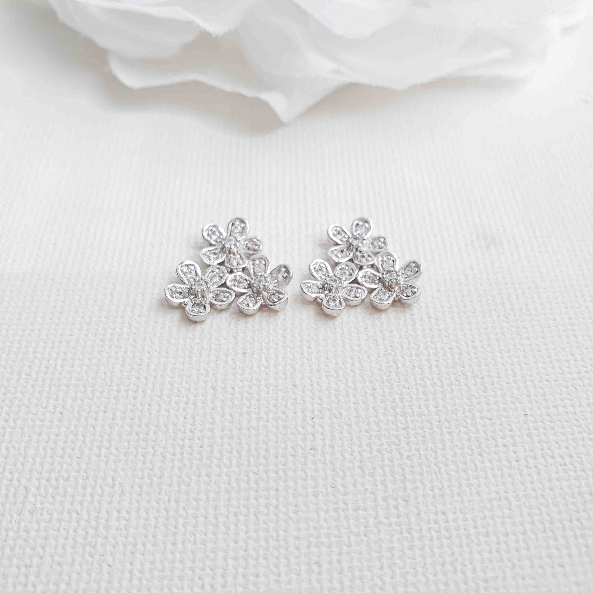 Choose Charlotte silver flower earrings for a delicate and elegant look. The beautifully crafted silver flower stud earrings feature three flowers with petals encrusted with sparkly cubic zirconia.