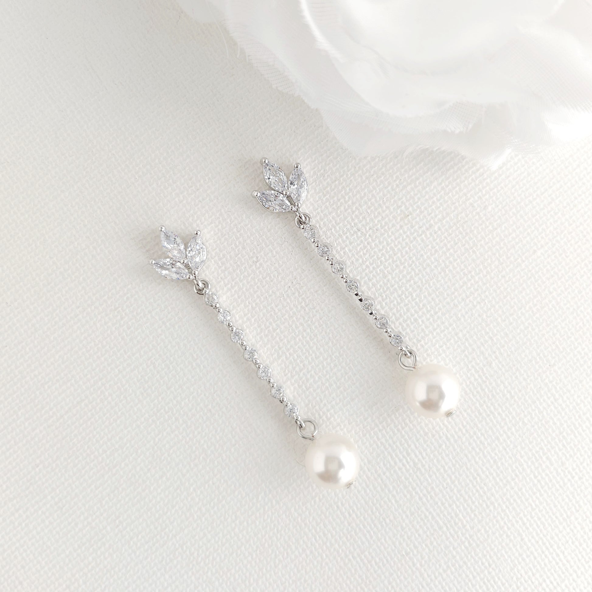 These thin and skinny long earrings are made of cubic zirconia and pearls with a CZ flower-shaped ear top with an array of tiny cubic zirconia crystals and pearl drops.