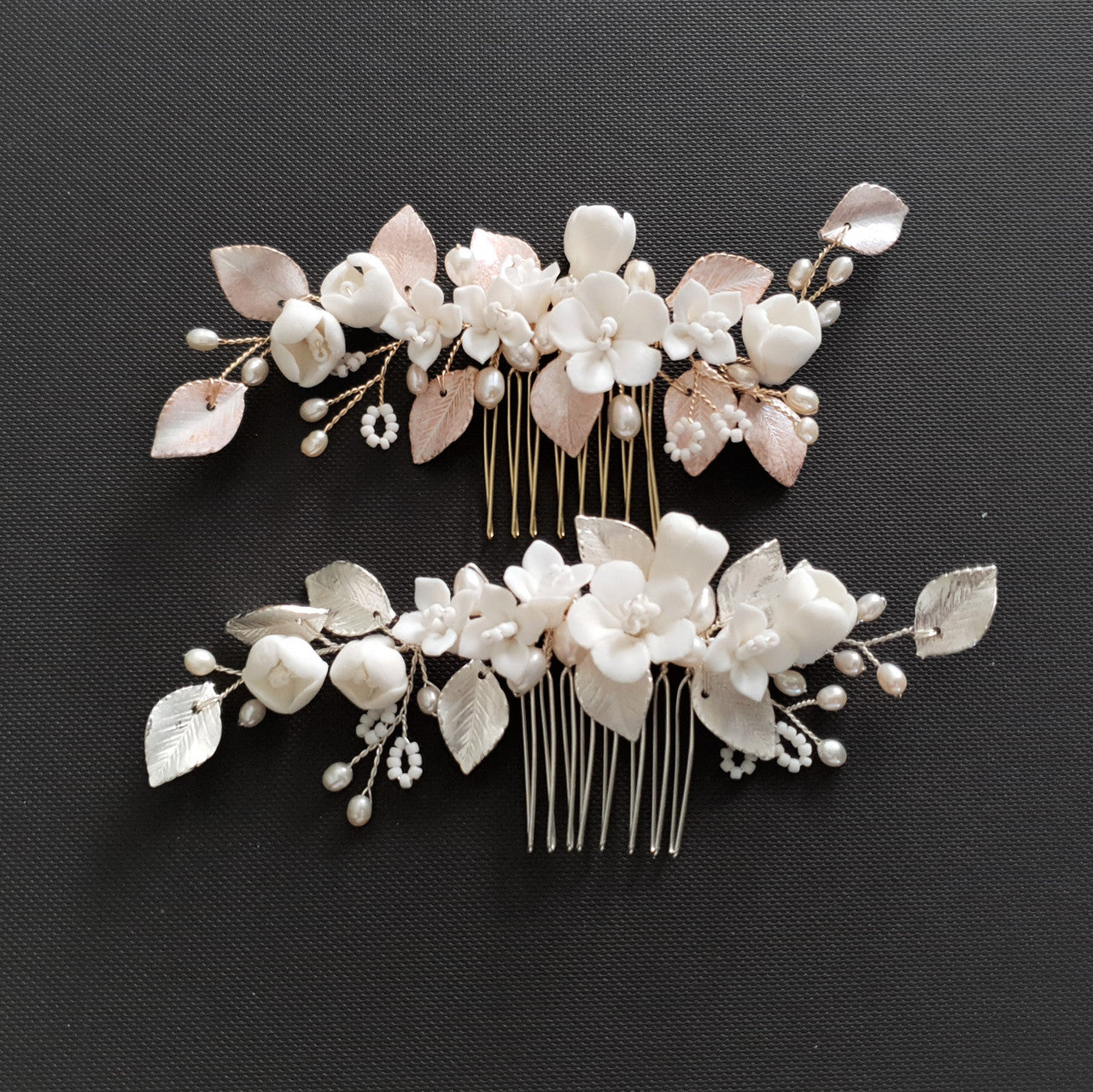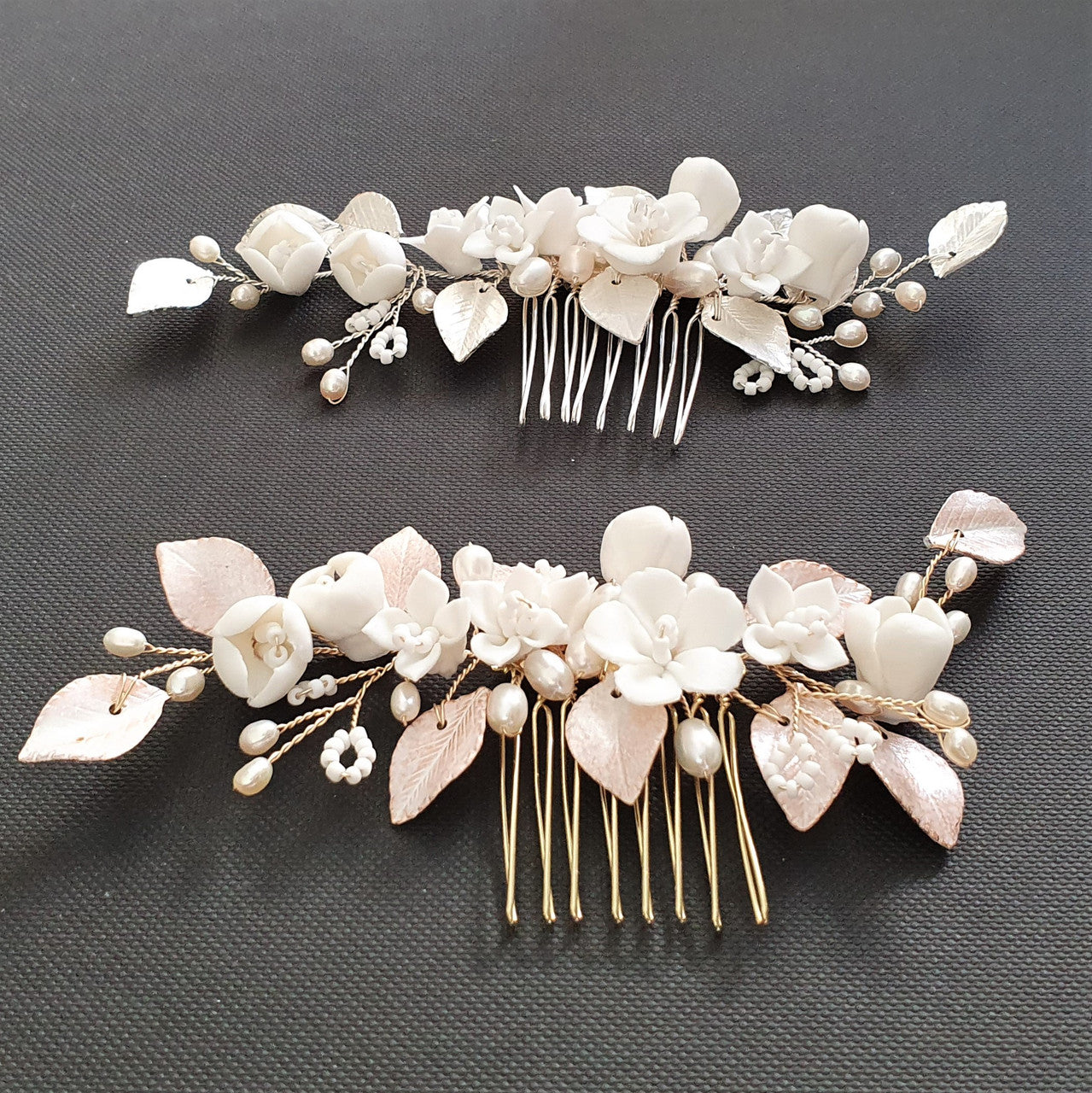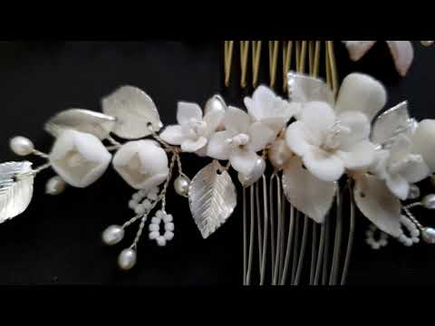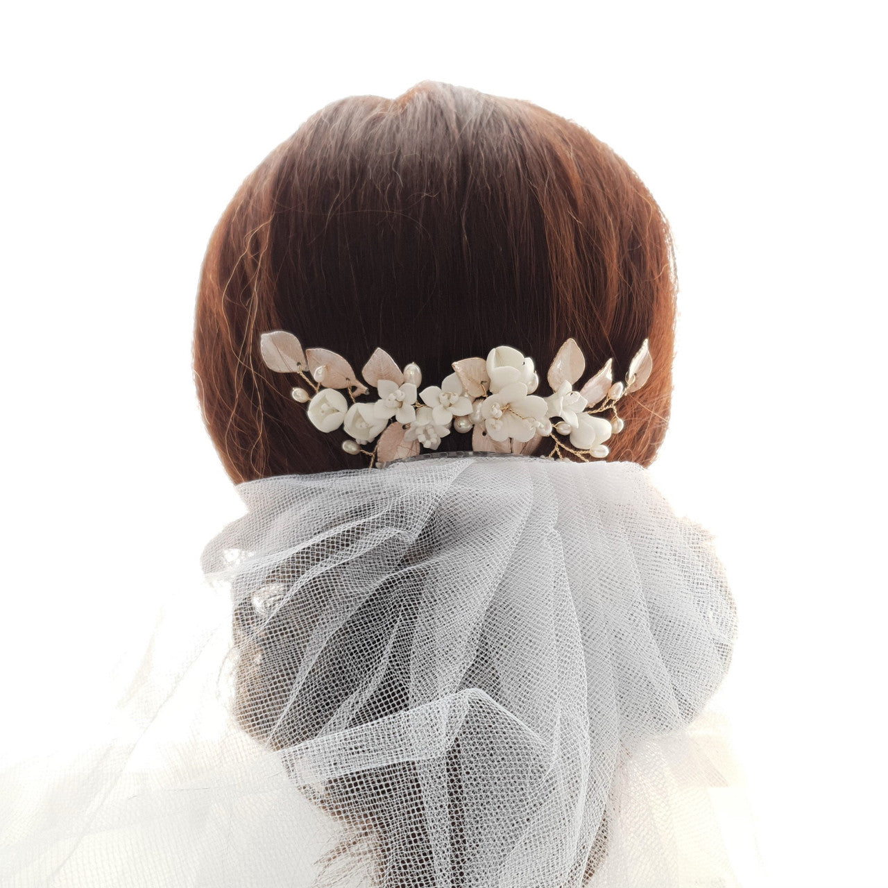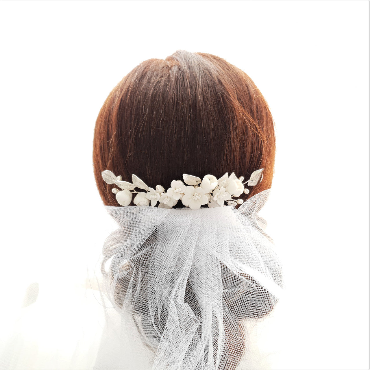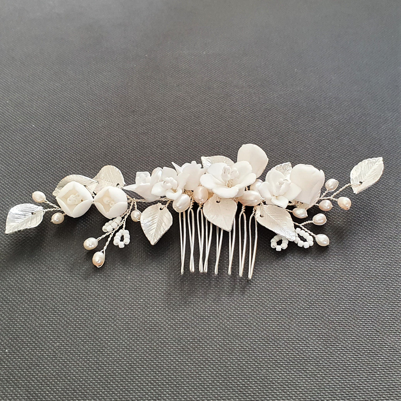This bridal hair comb is made of small white porcelain flowers and sparkly silver leaf with scattered pearls that are all wire wrapped on to a silver hair comb