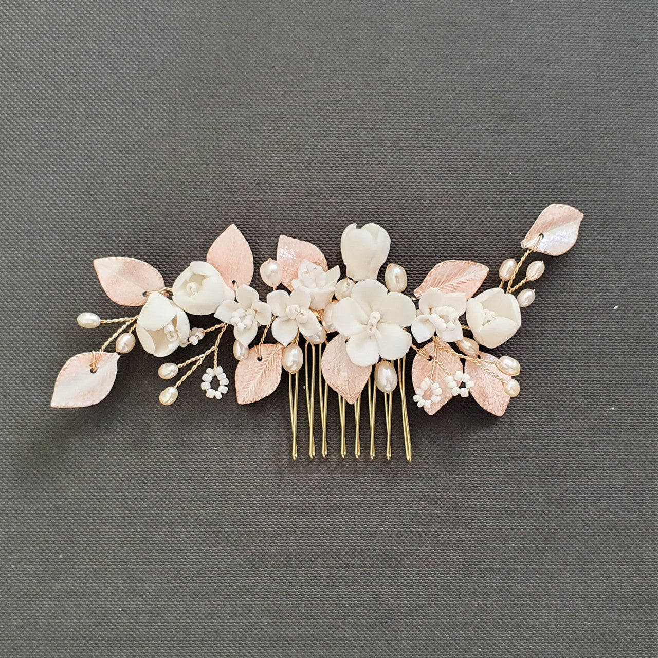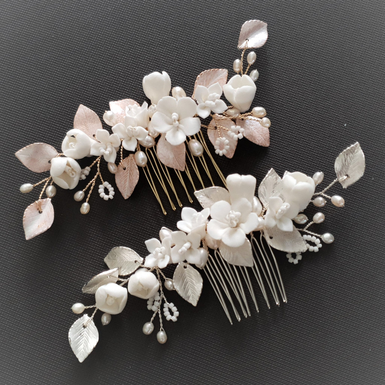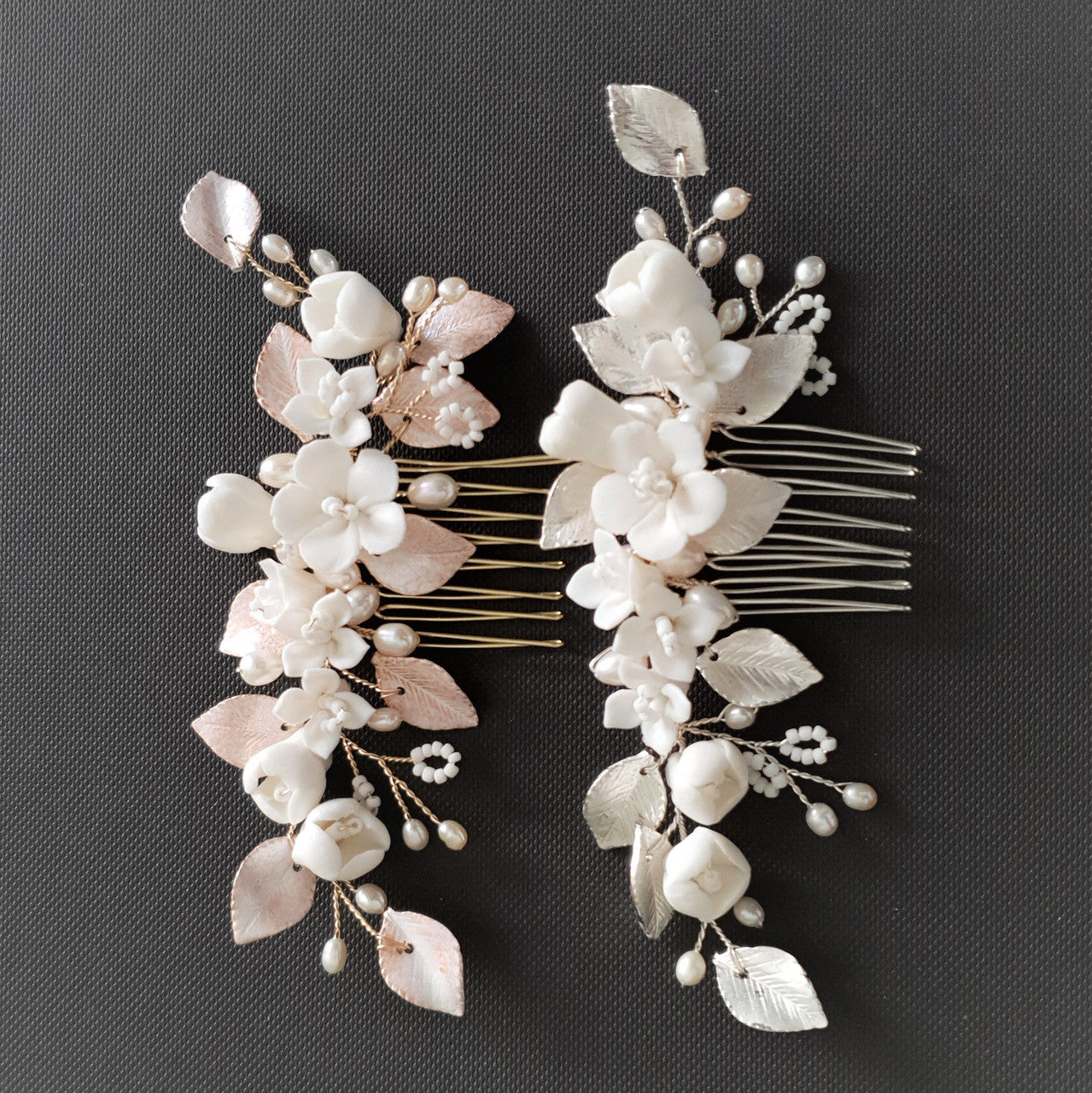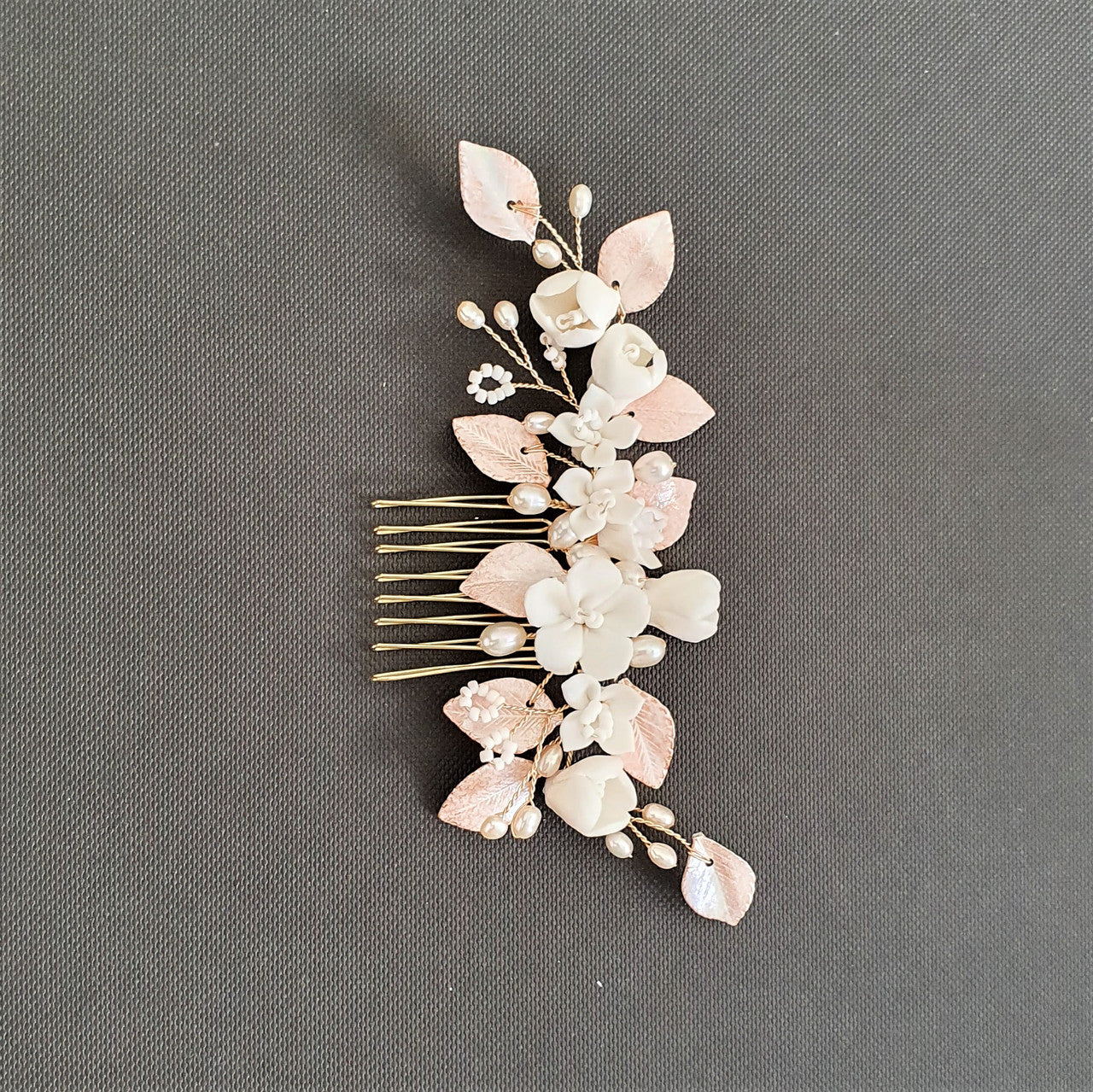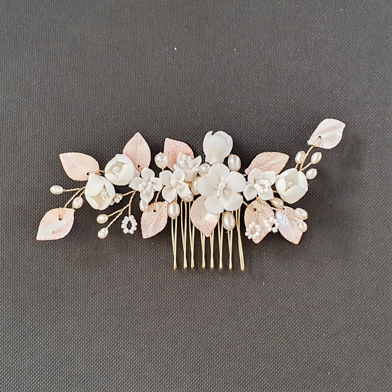 This bridal hair comb is made of small white porcelain flowers and sparkly silver leaf with scattered pearls that are all wire wrapped on to a silver hair comb