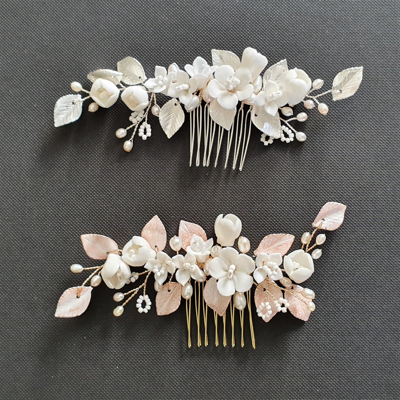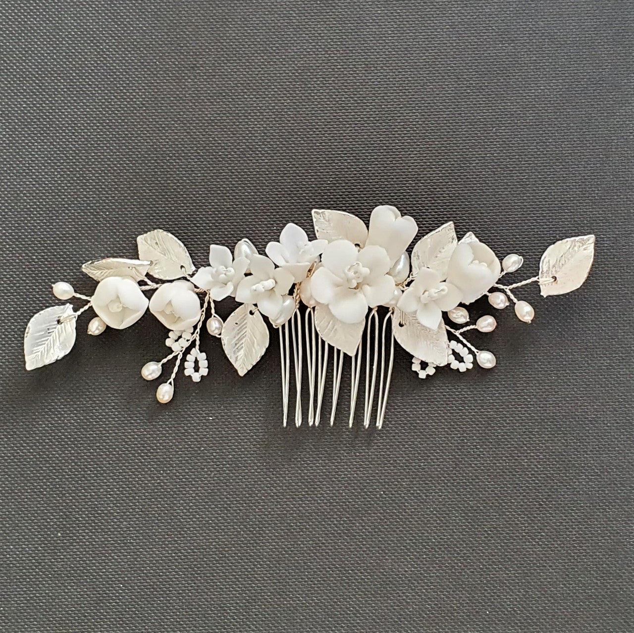 Small White Flower and Silver Leaf Hair Comb for Brides