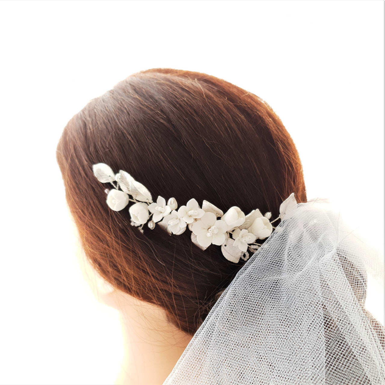A pretty bridal hair comb made of small white flowers and silver leaves is perfect for a bride on her wedding day.