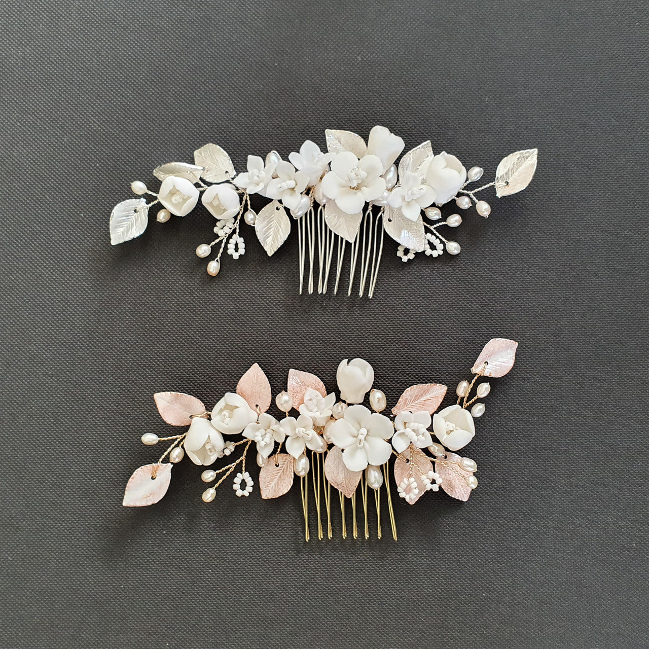 This pretty bunch of small flower and leaf silver hair comb would complement many of your bridal hairstyles with long or short hair and your wedding dresses and themes.