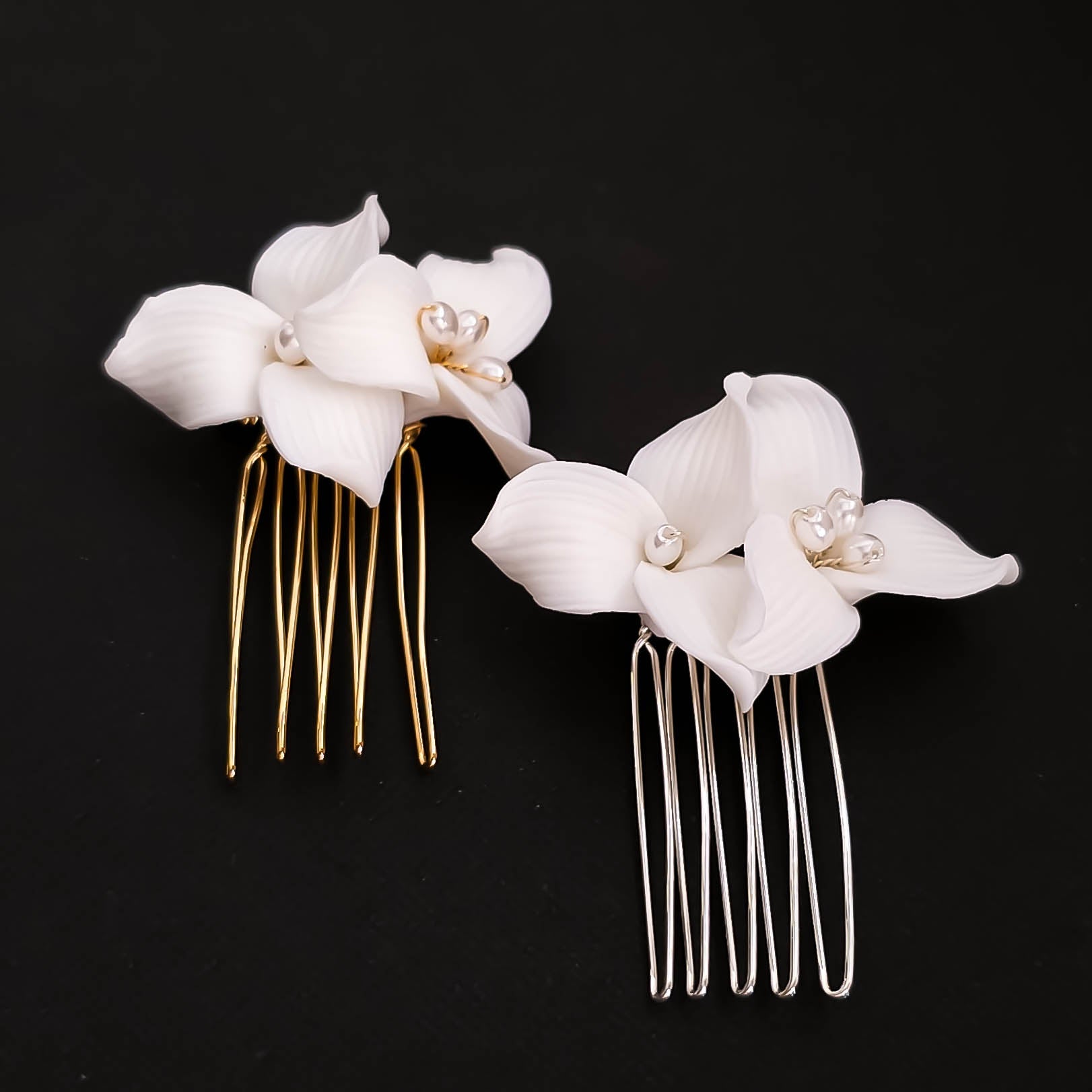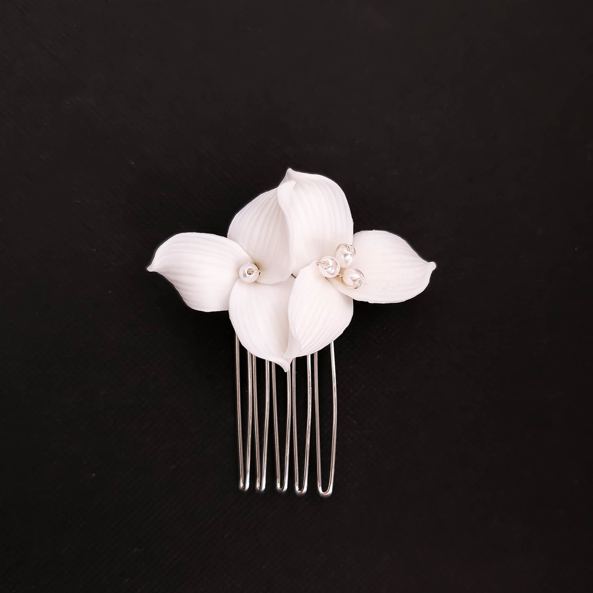 Craftsmanship & Design: This small wedding hair comb features two delicate white ceramic flowers, each accented with a tiny pearl in the center. The flowers are carefully arranged on a secure gold comb base.