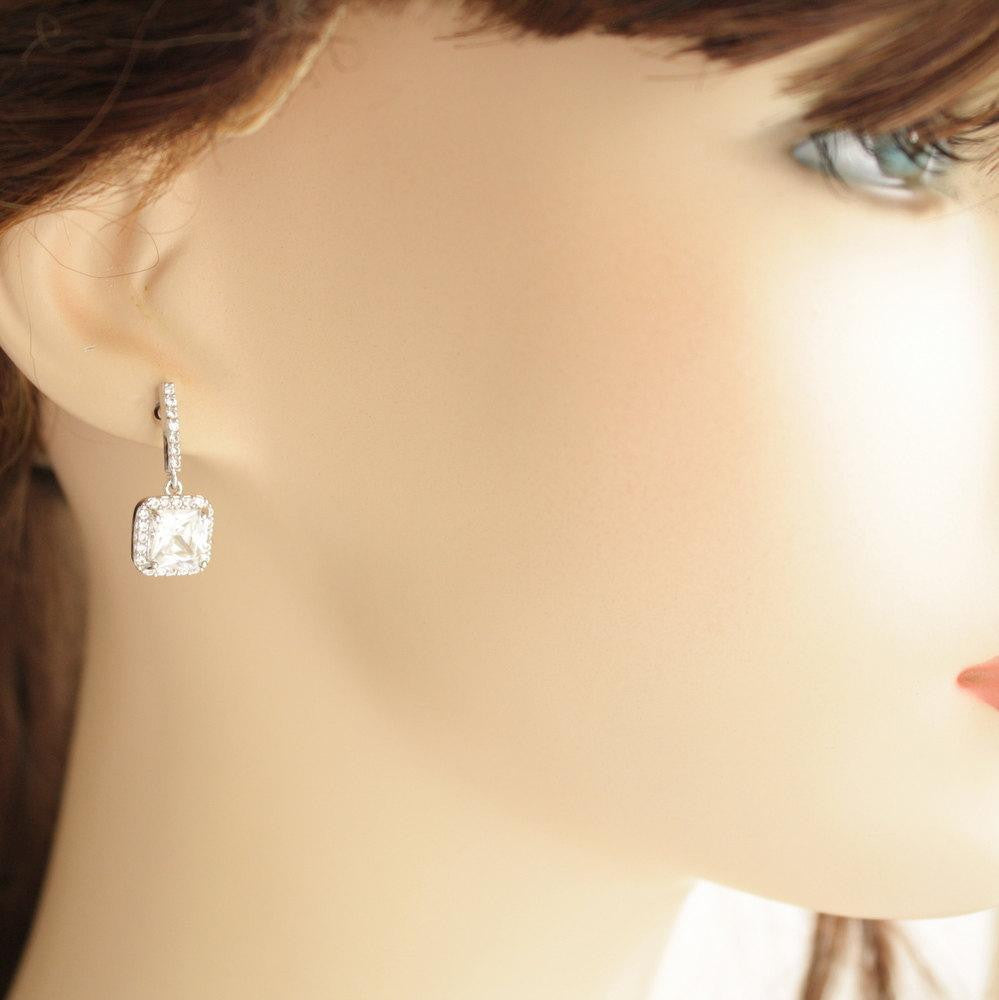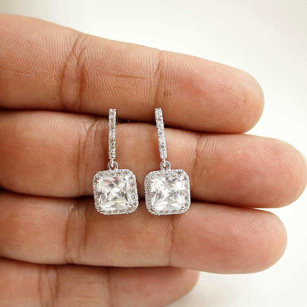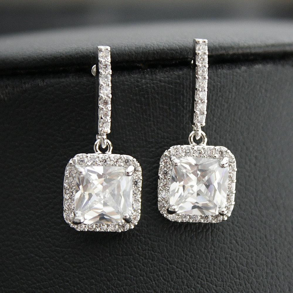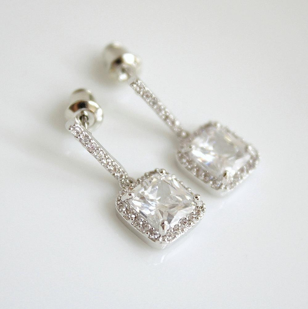 Small, dainty Square princess cut clear Cubic Zirconia are framed by tiny cubic zirconia in rhodium-plated brass. Pretty earrings for bridesmaids and great for brides looking for square shape earrings and need it simple.