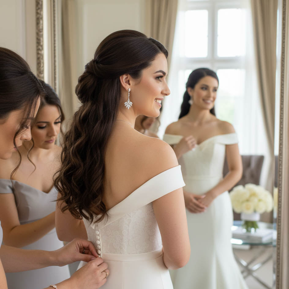 Dazzling Cubic Zirconia Sparkle: Each earring features meticulously set, high-grade cubic zirconia stones, expertly cut to capture and reflect light with exceptional brilliance. Experience the captivating sparkle that adds a touch of glamour to your wedding day or any event where you want to shine. These are truly statement bridal earrings.