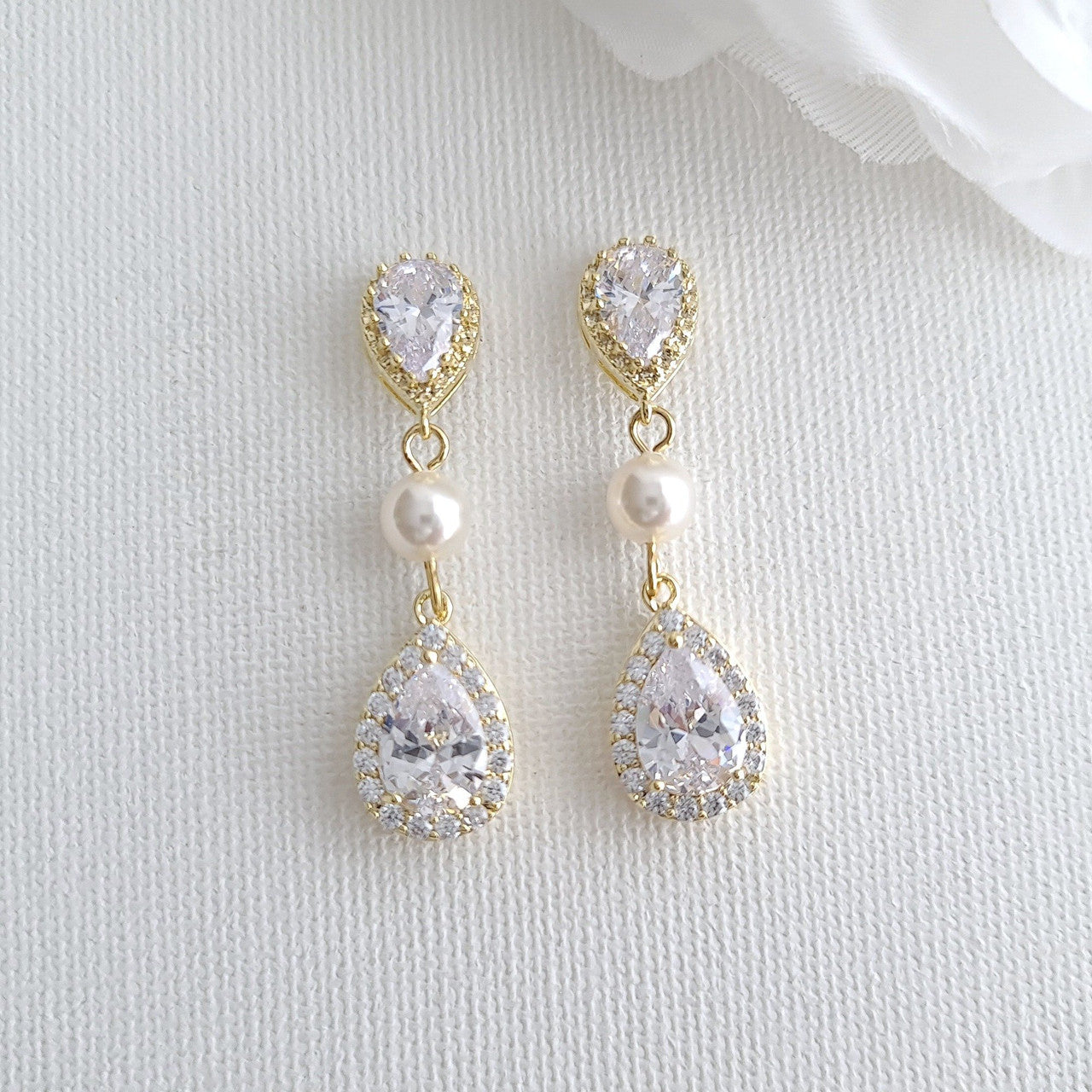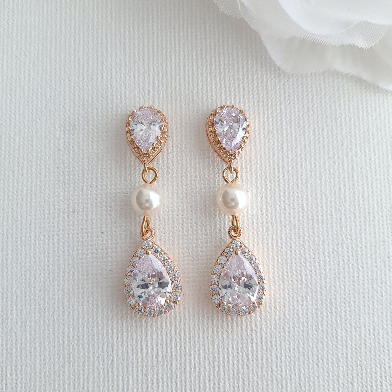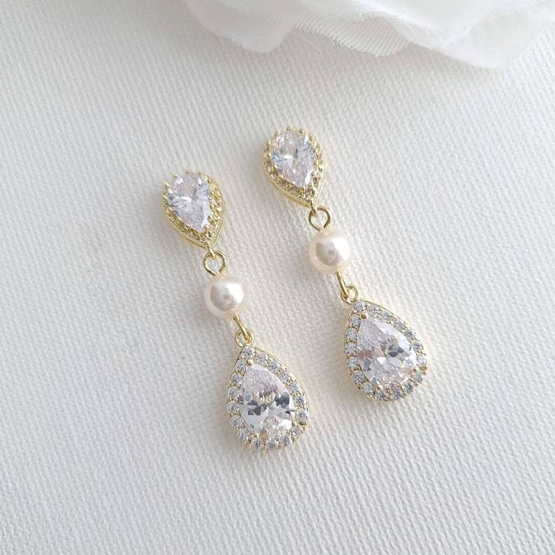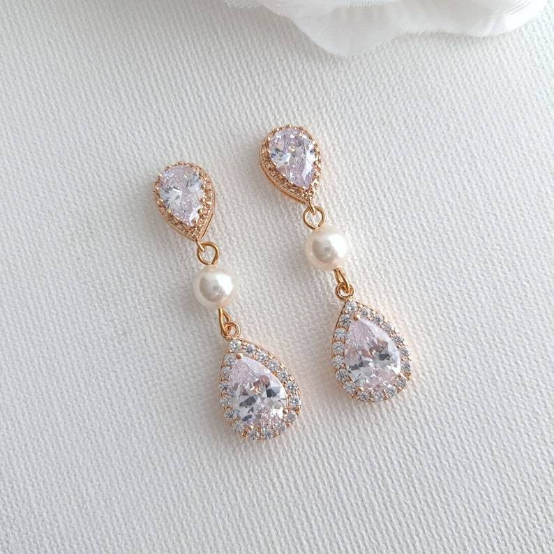 Flowing with elegance, these teardrop bridal earrings are small to mid-sized earrings perfect for brides and bridesmaids. These teardrop bridal earrings are made with sparkling cubic zirconia and pearls.
