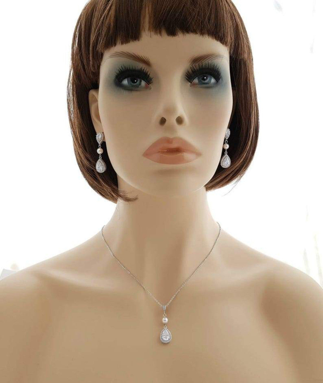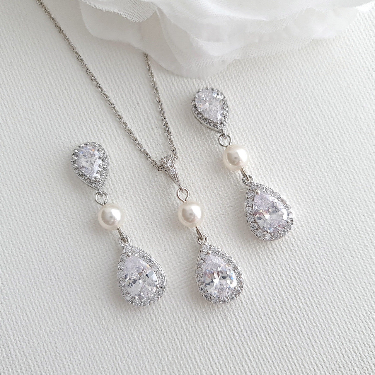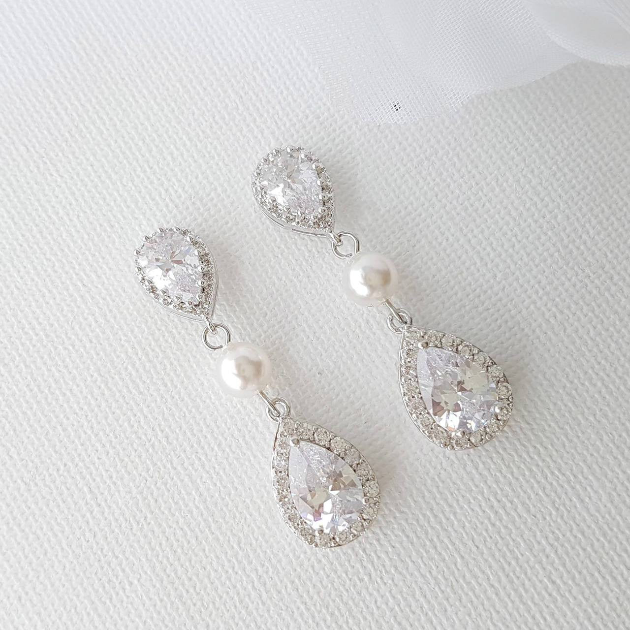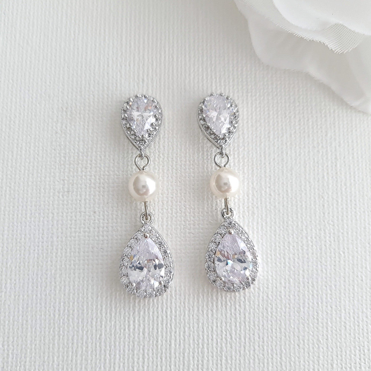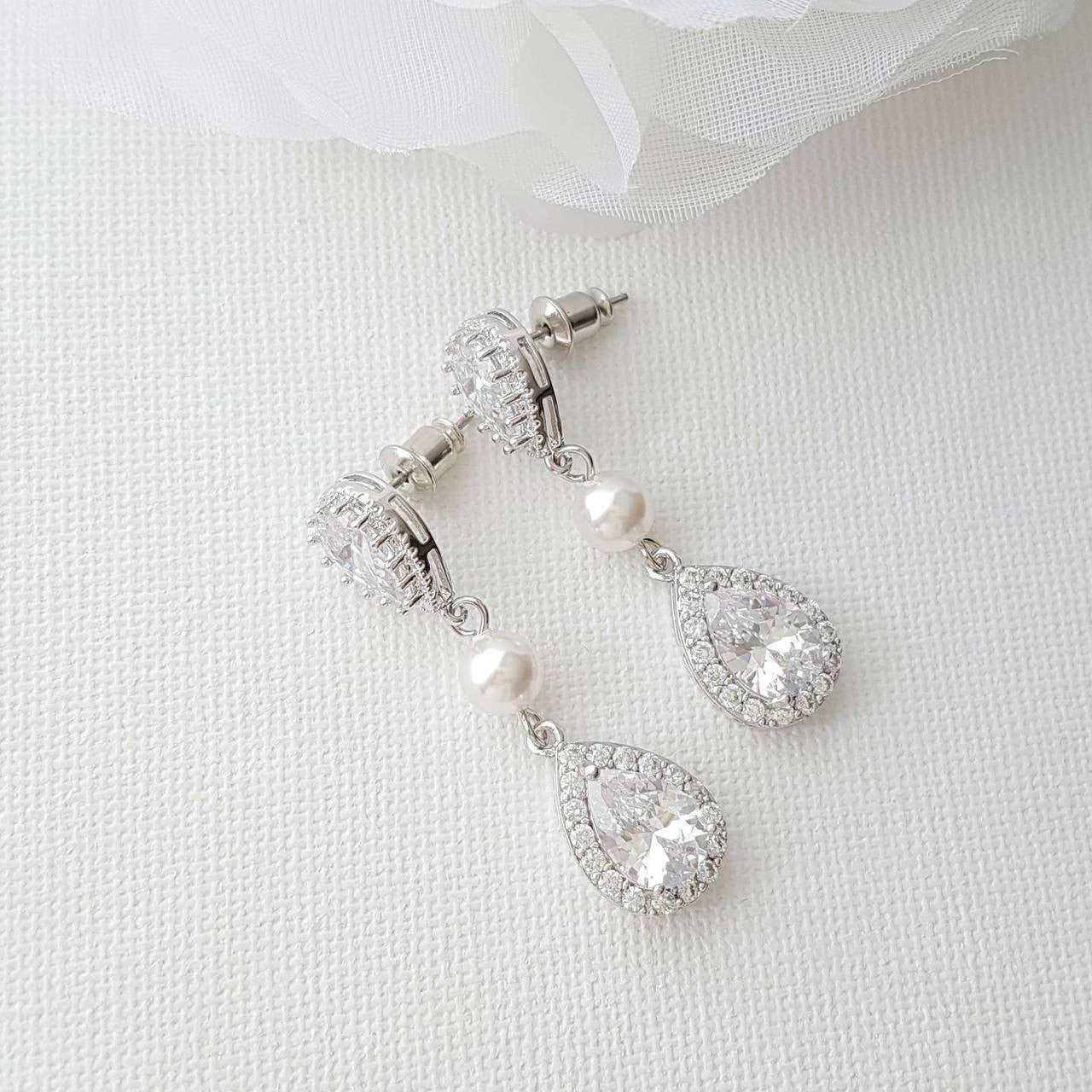 Silver Teardrop Bridal Earrings with Pearl and Cubic Zirconia- Mid Sized to Small Earrings
