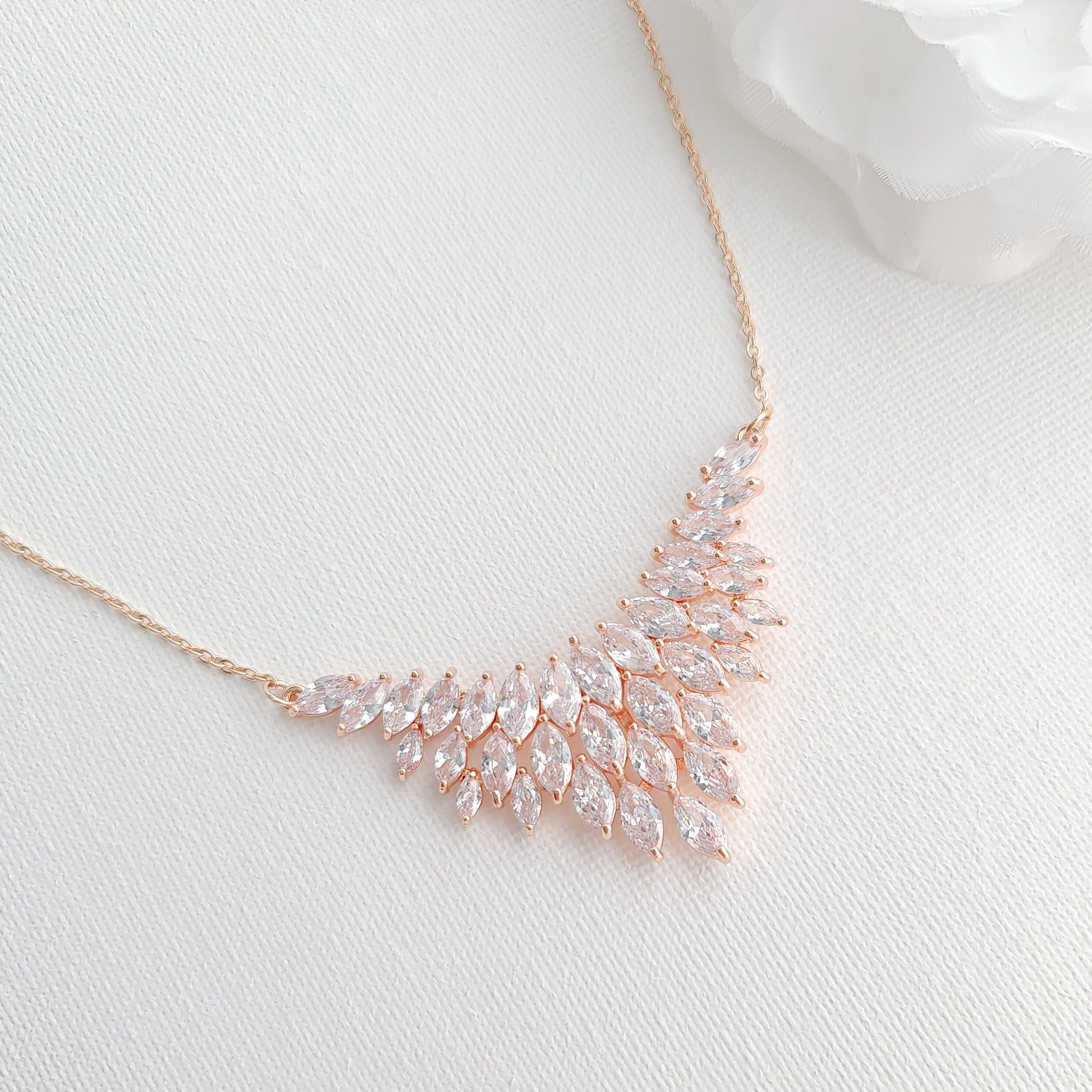 The focal point in this stunning rose gold necklace is the cluster of leaf-shaped V designs made of marquise cubic zirconia crystals that add a touch of elegance and extra oomph to your wedding, formal, and prom dresses instantly.