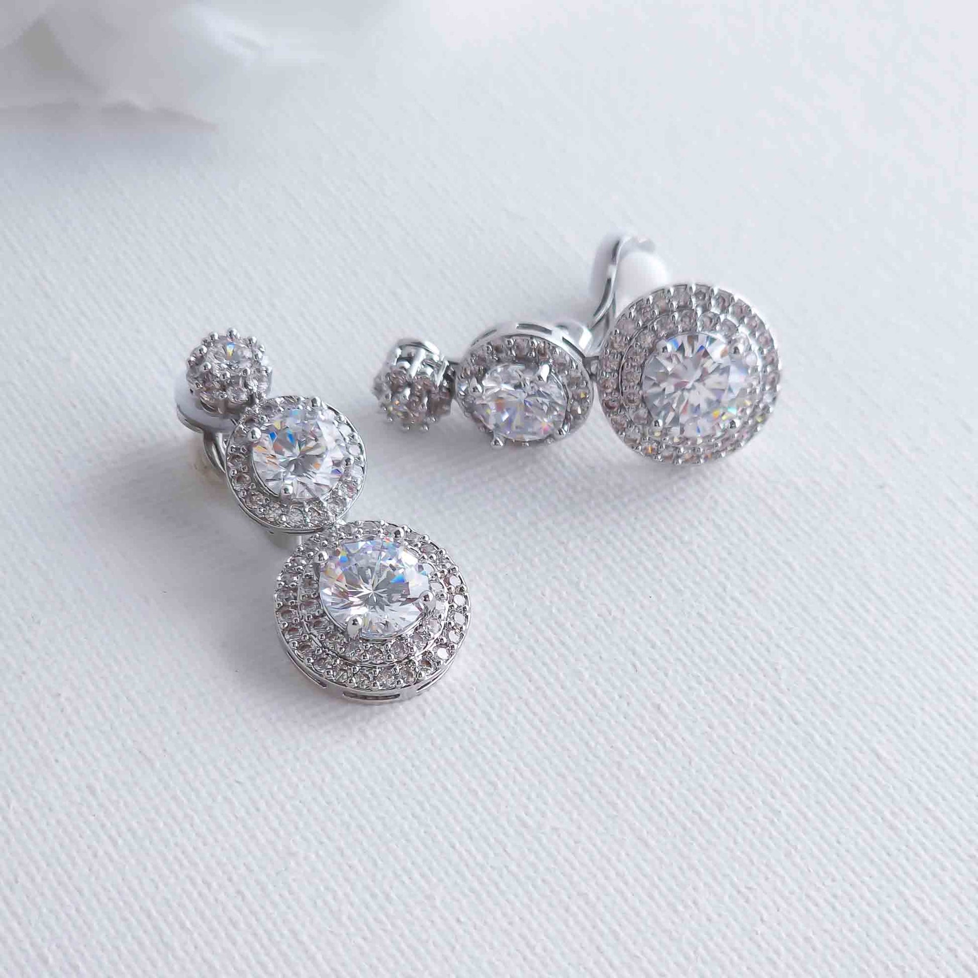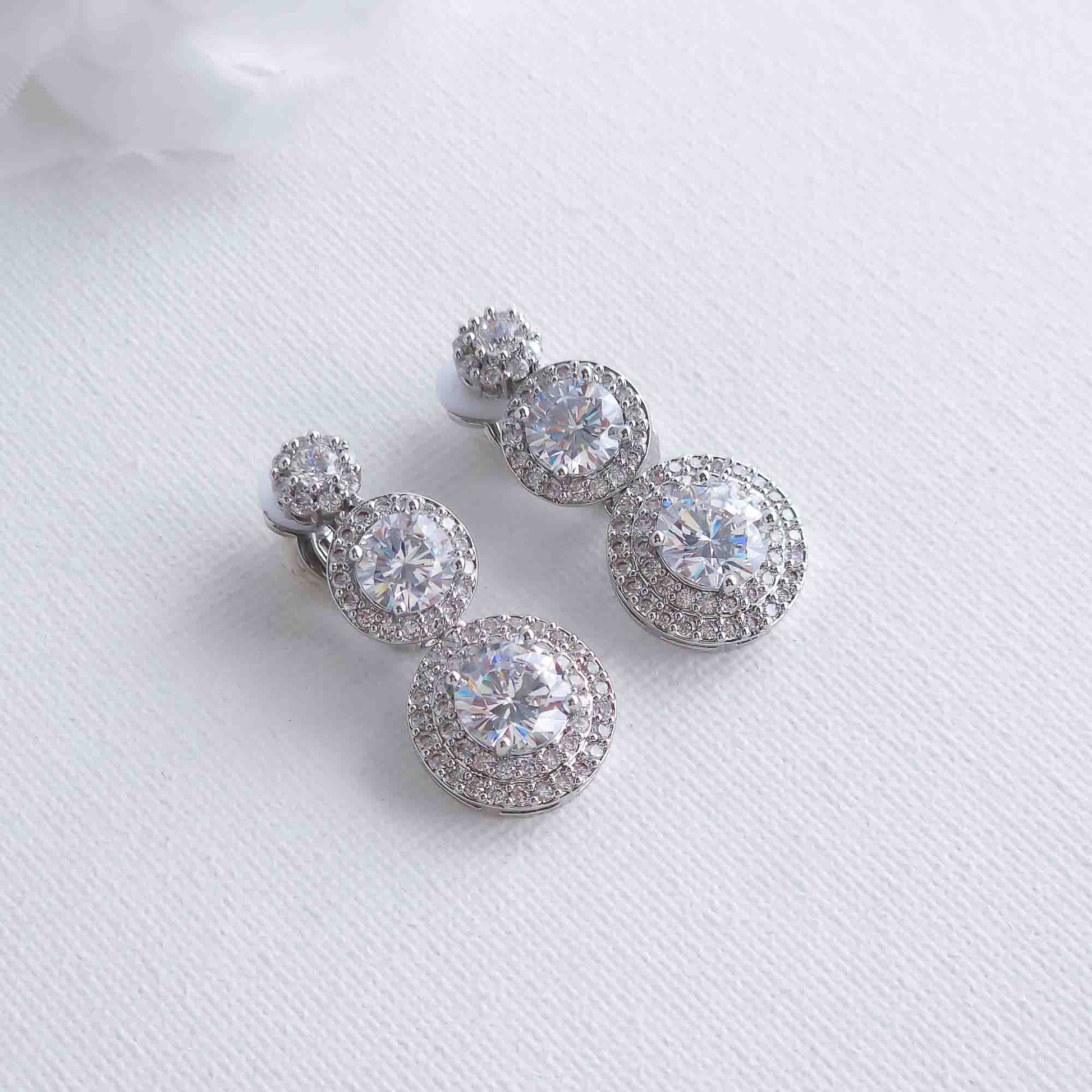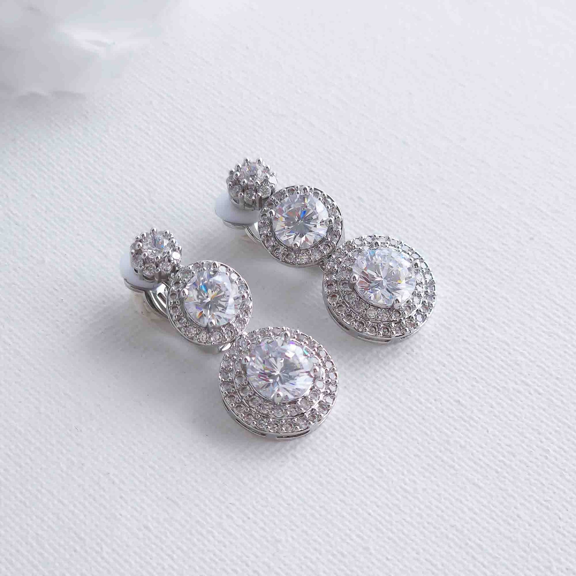 These dazzling wedding clip-on earrings showcase three cascading rounds of halo-set cubic zirconia stones, adding a touch of unparalleled sparkle and sophisticated style to any bridal ensemble.