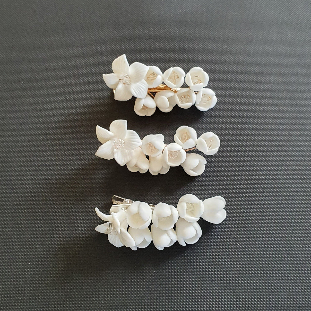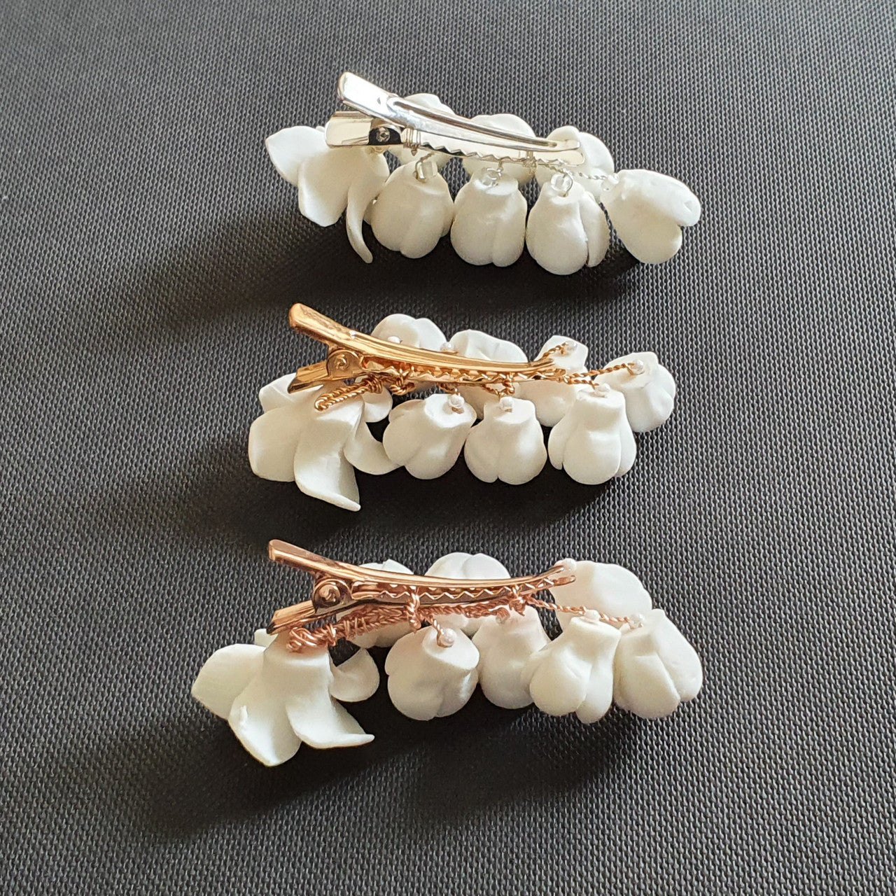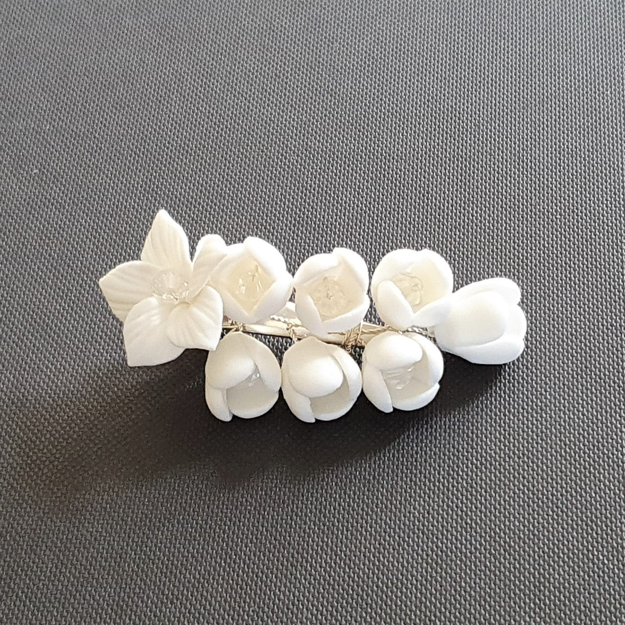 In flowers are made of porcelain, the white flower barrette looks gorgeous with tiny clear crystal bead that is wire wrapped in the middle of every flower. The hair clip/barrette flowers are wire wrapped and twisted on the clip with silver wire.