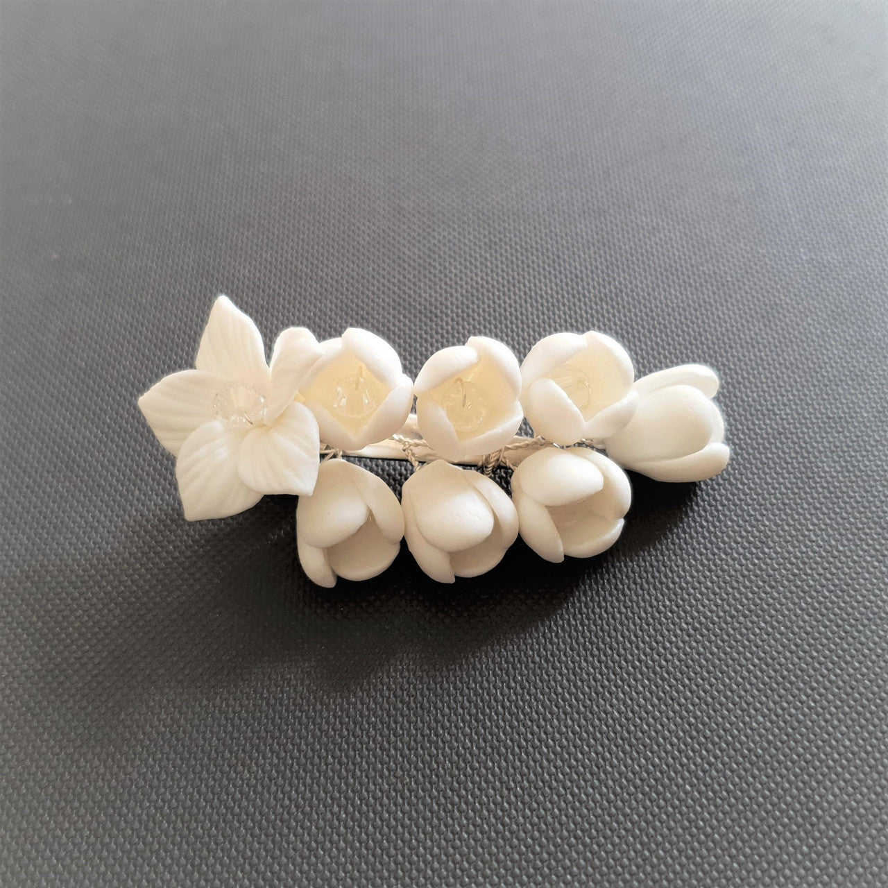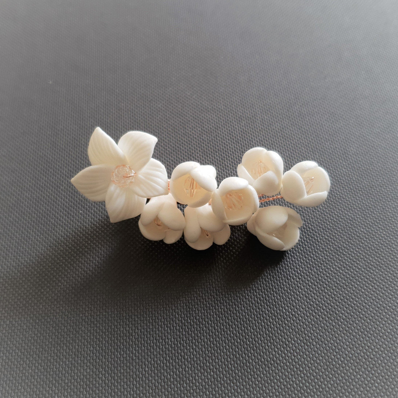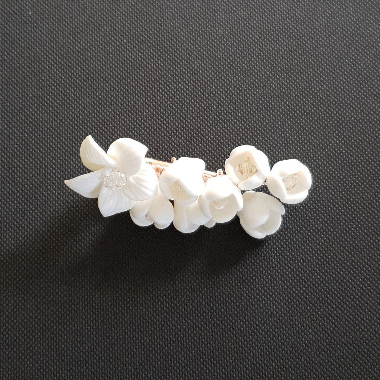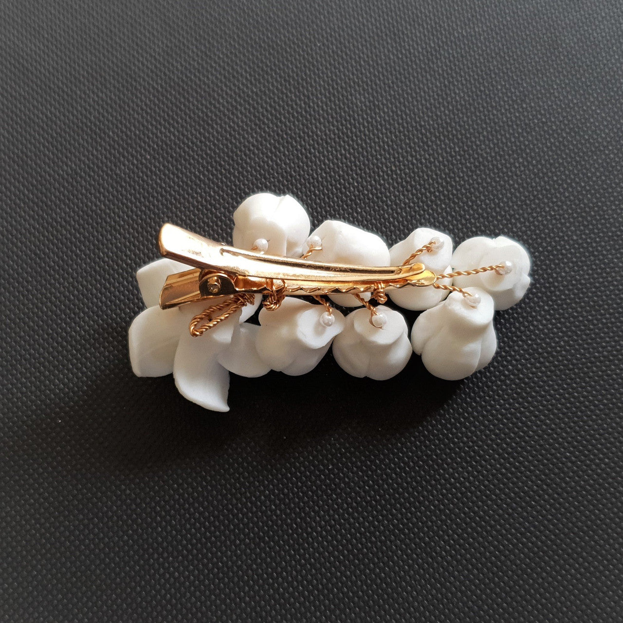 In flowers are made of porcelain, the white flower barrette looks gorgeous with tiny clear crystal bead that is wire wrapped in the middle of every flower. The hair clip/barrette flowers are wire wrapped and twisted on the clip with silver wire.